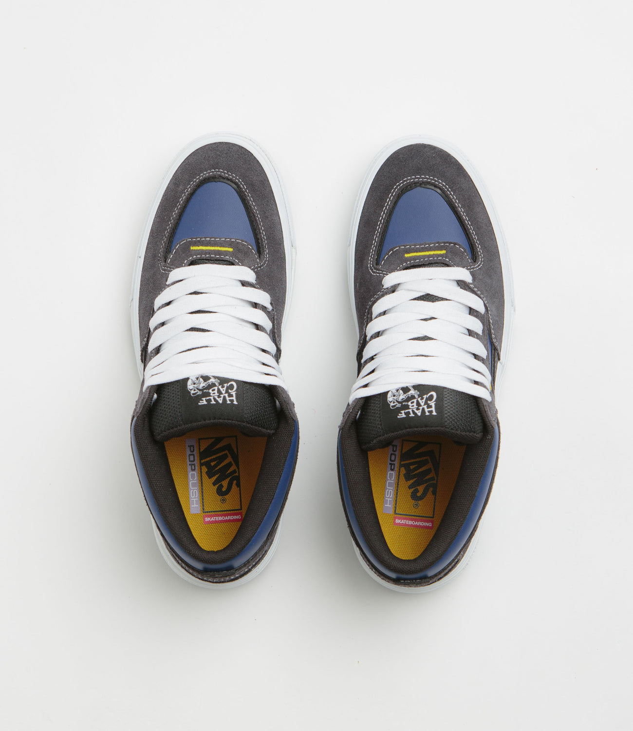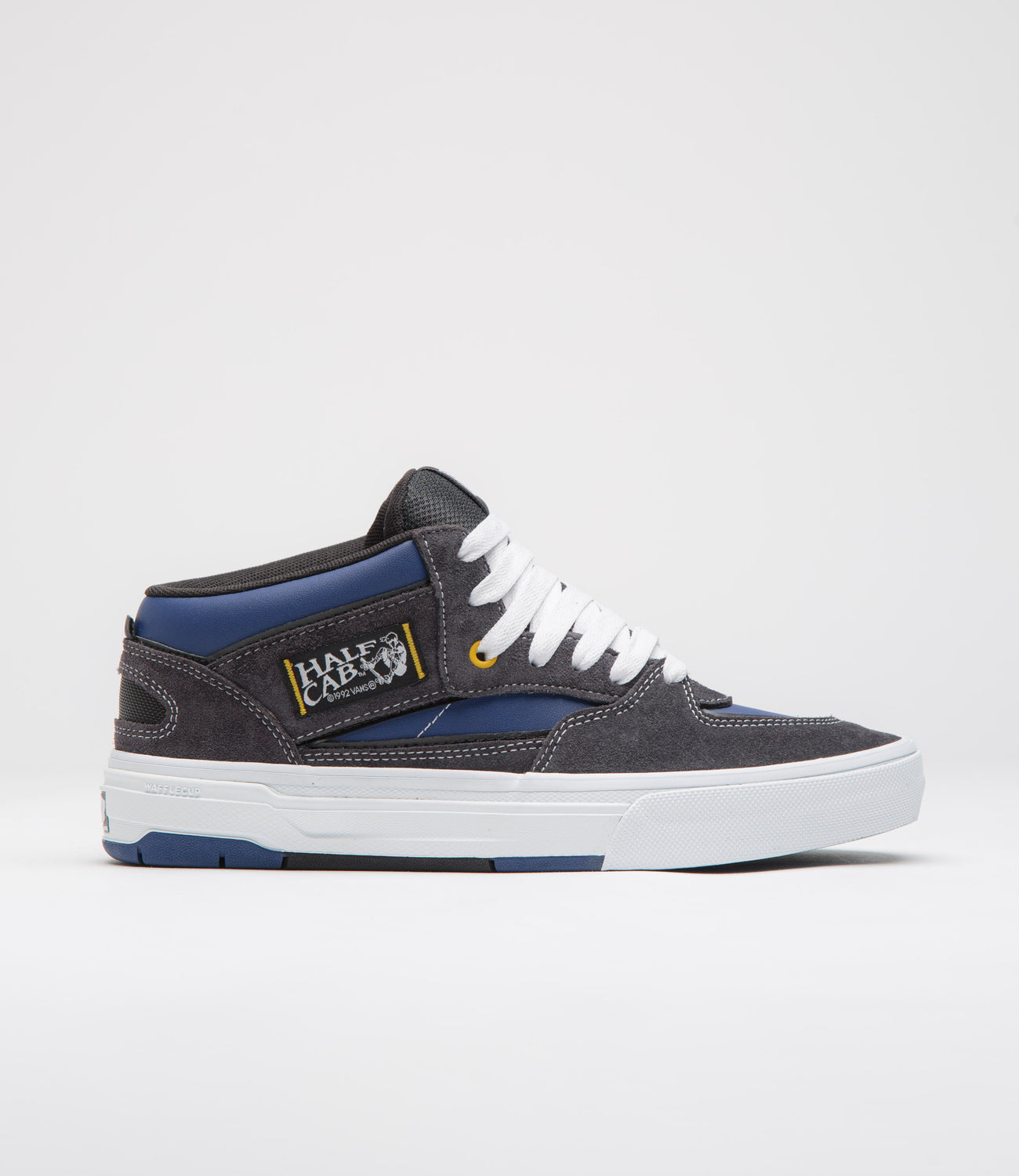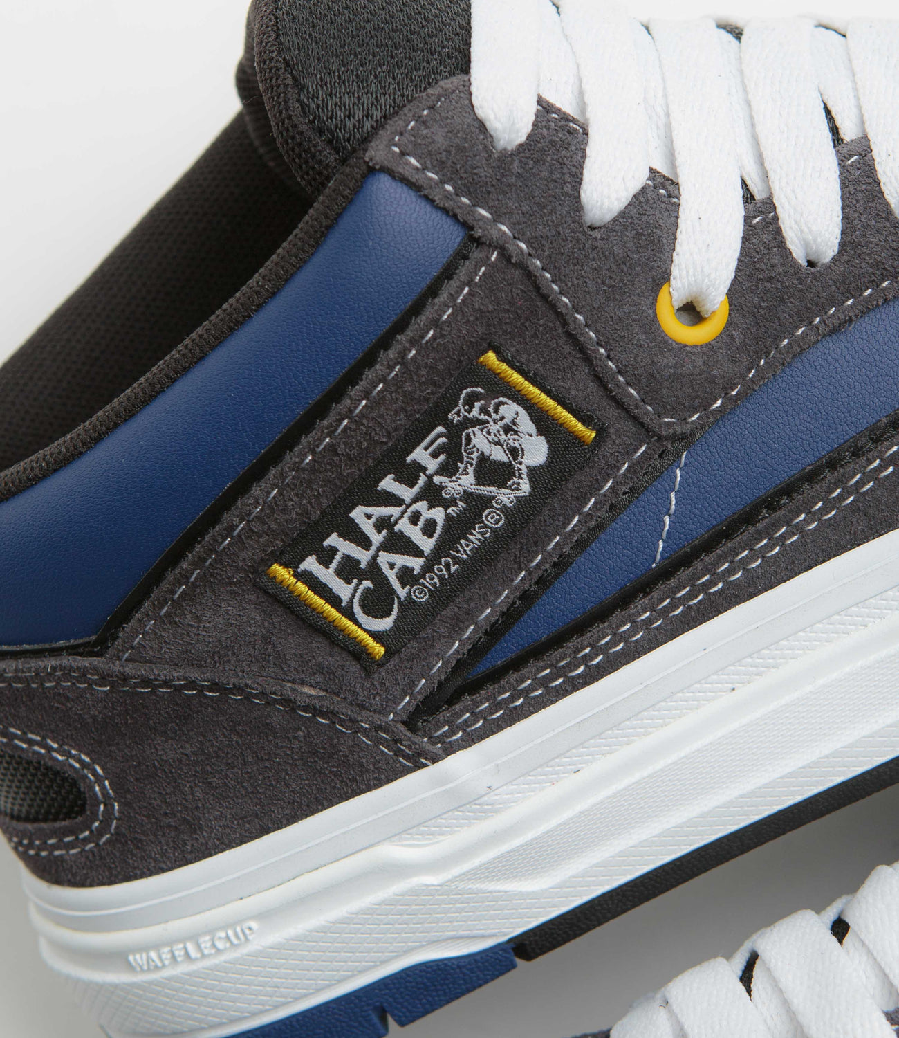 This Half Cab from Vans’ Skate Classics line keeps the iconic look clean while adding an updated design. Suede and leather uppers with contrast stitching and reinforced DURACAP™ layers make it tough where it counts, while WaffleCup™ construction and a SickStick sole give board feel and grip you can trust. Inside, POPCUSH™ insoles soften heavy landings, and the two-part foxing plus original Waffle tread keep your feet locked in. Finished in black and navy with woven tongue tabs and Half Cab flag labels.