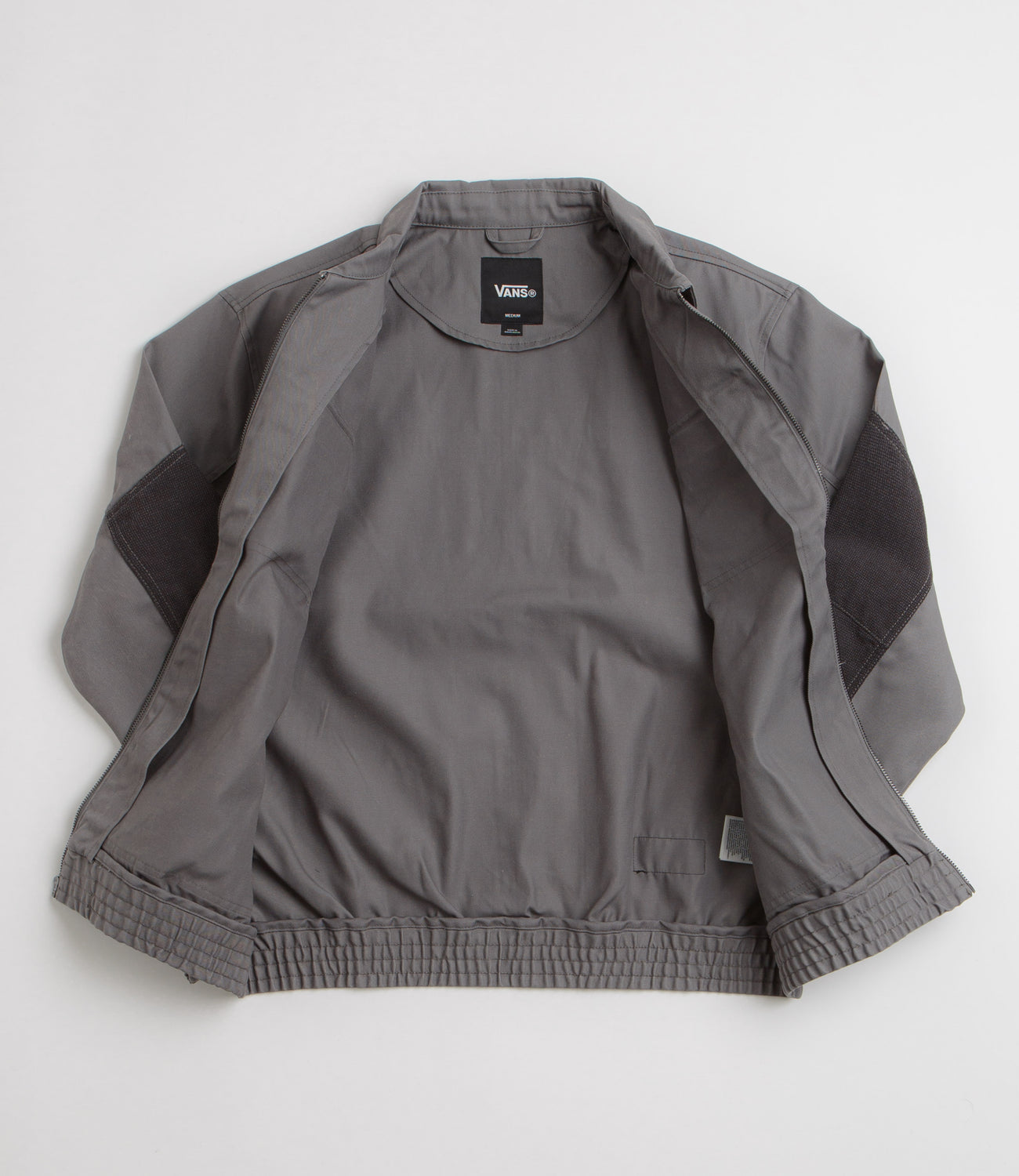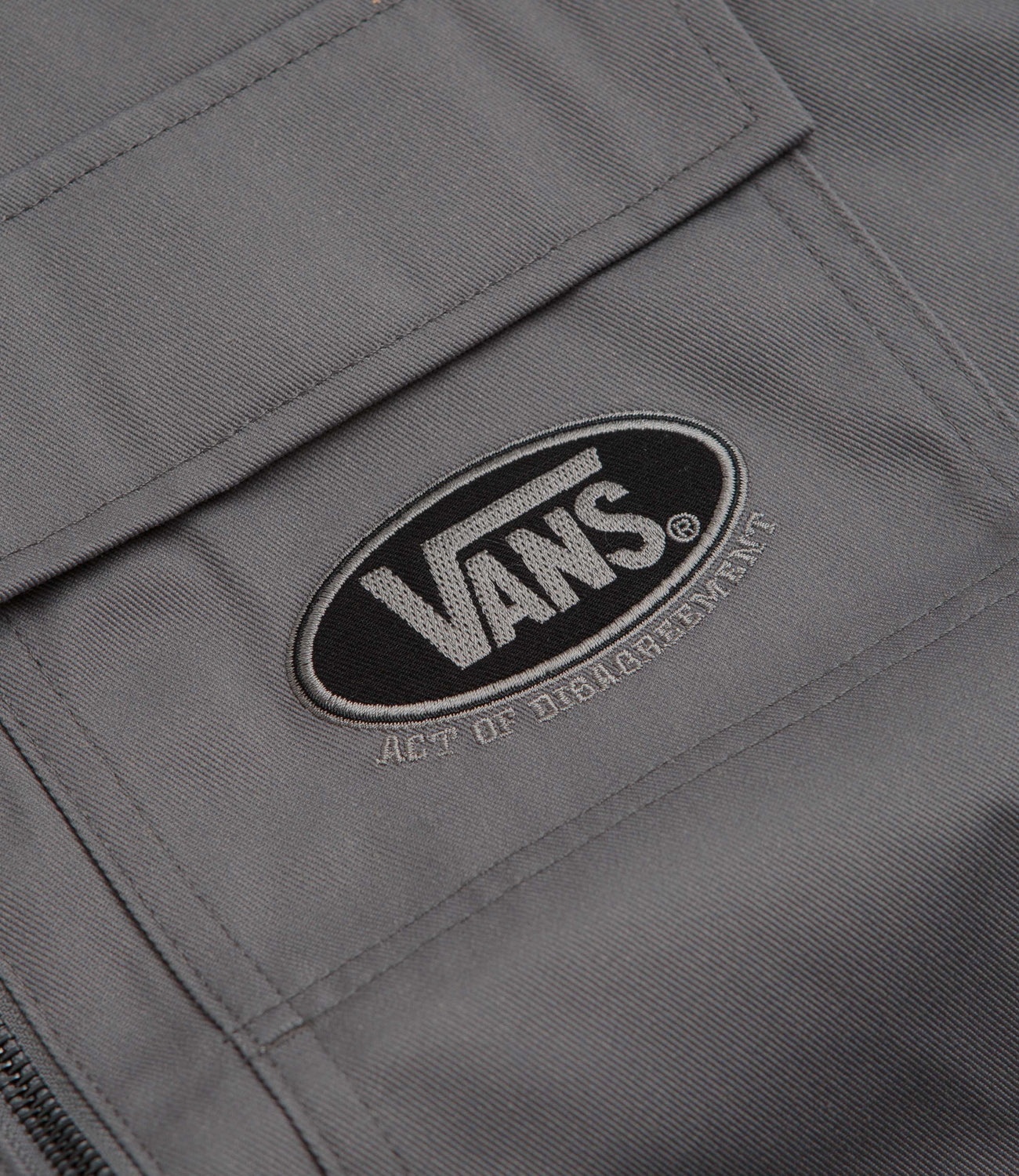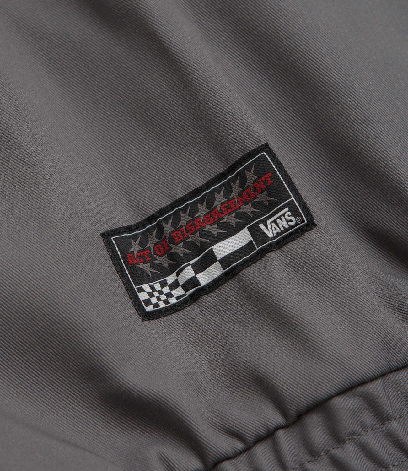 Vans x SlamJam AOD A-Abrasion Jacket in Smoked Pearl. Detailed with high-tensile Kevlar® panels, this Vans jacket is designed in collaboration with Act of Disagreement. Featuring a stand collar, contrast stitching, a full length zipper fastening and an unlined inner, this smoked grey Vans jacket is finished with two chest pockets, two front pockets, elasticated cuffs and woven front and rear branding.