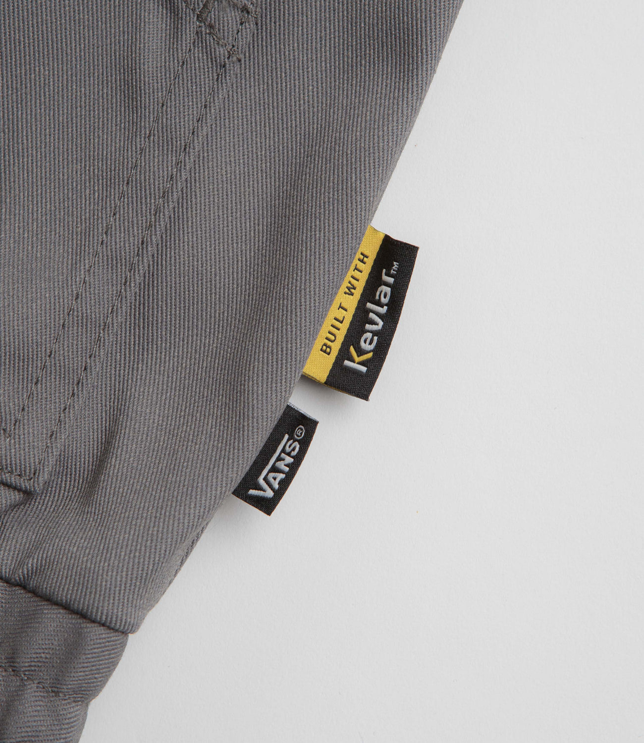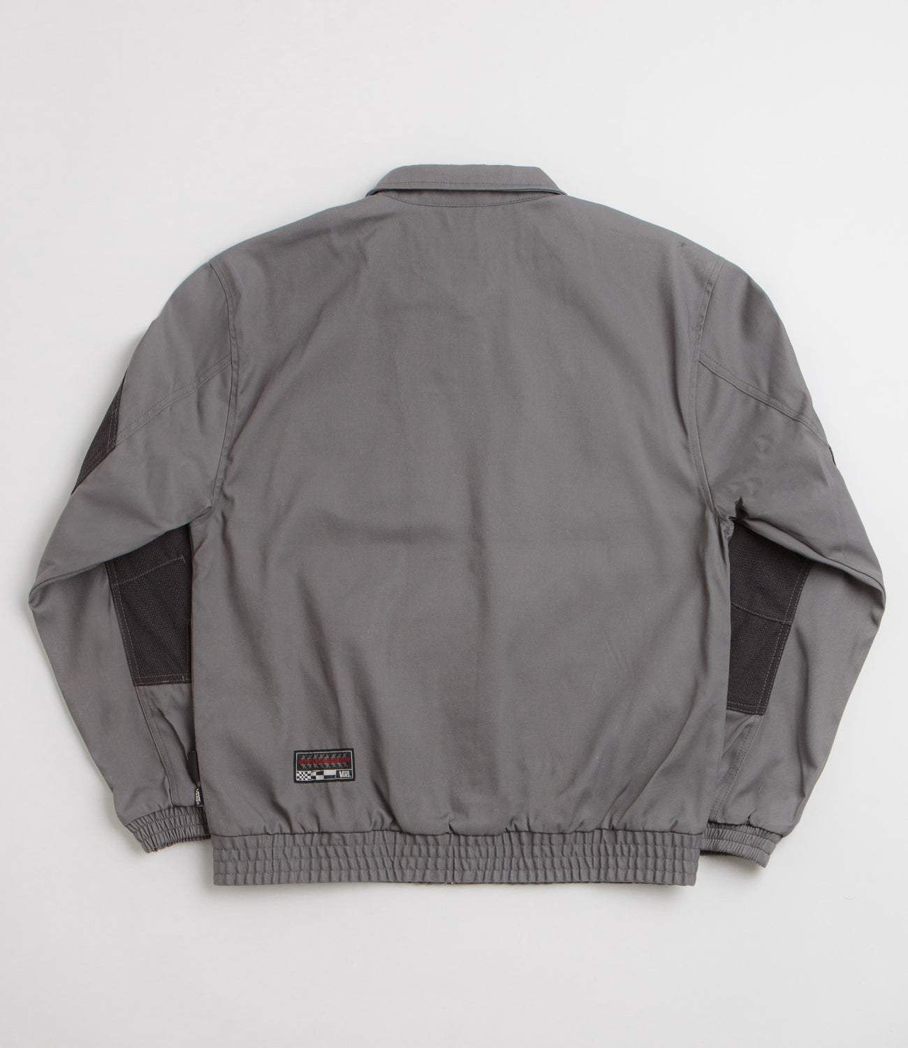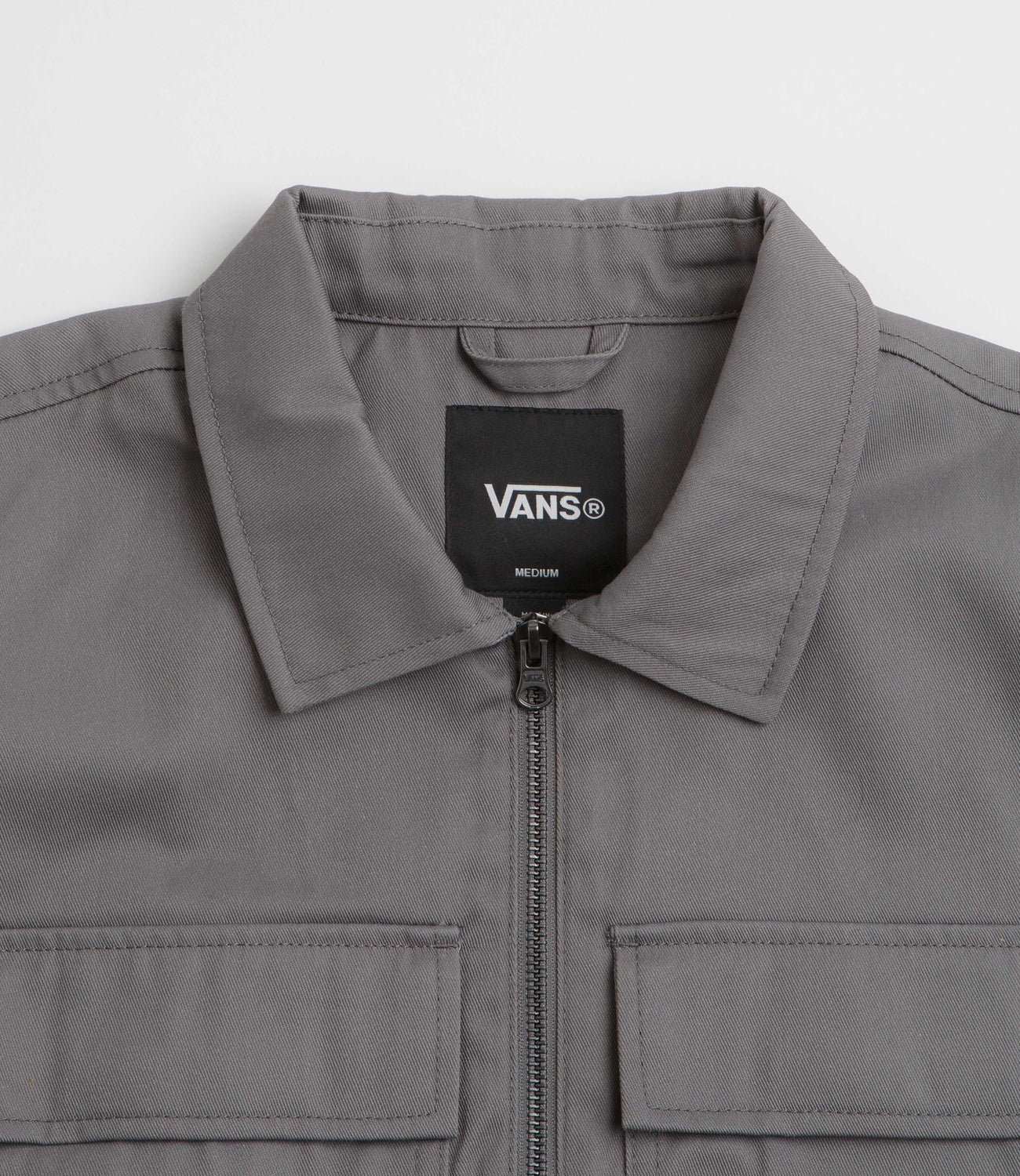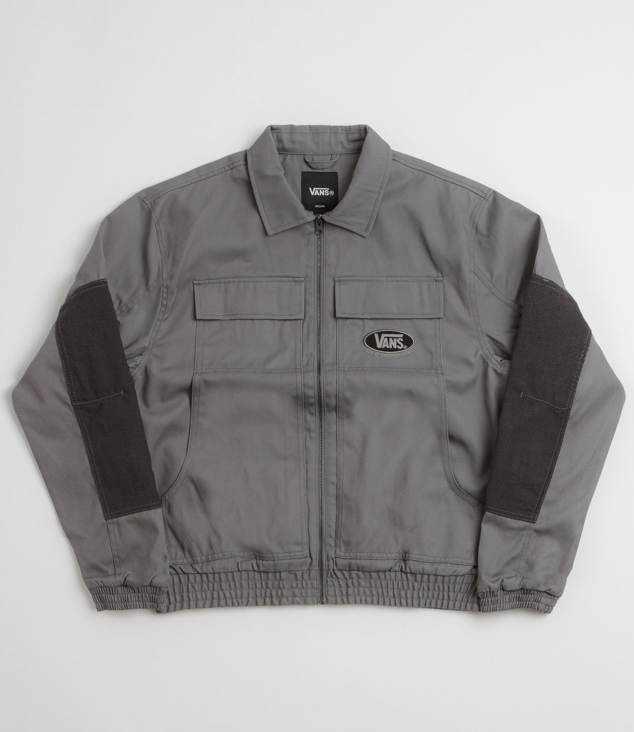 Vans x SlamJam AOD A-Abrasion Jacket in Smoked Pearl. Detailed with high-tensile Kevlar® panels, this Vans jacket is designed in collaboration with Act of Disagreement. Featuring a stand collar, contrast stitching, a full length zipper fastening and an unlined inner, this smoked grey Vans jacket is finished with two chest pockets, two front pockets, elasticated cuffs and woven front and rear branding.