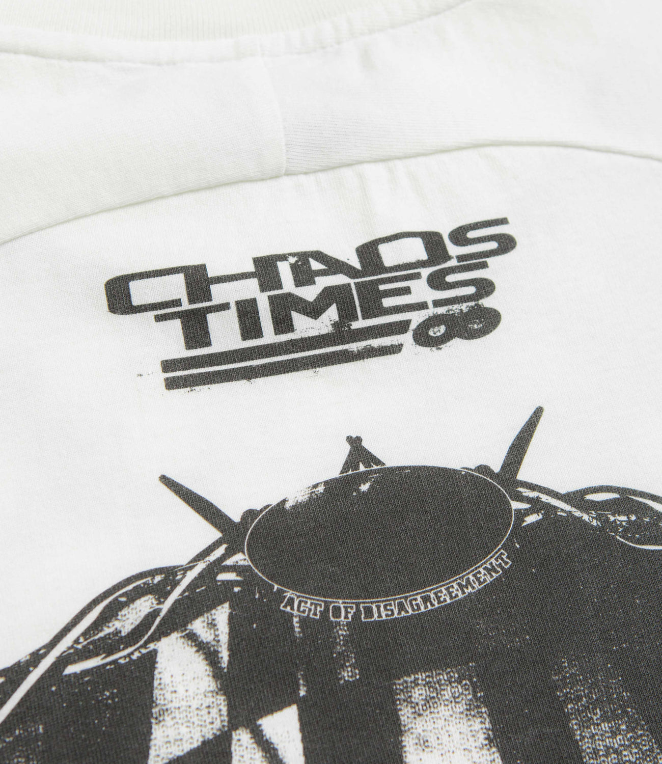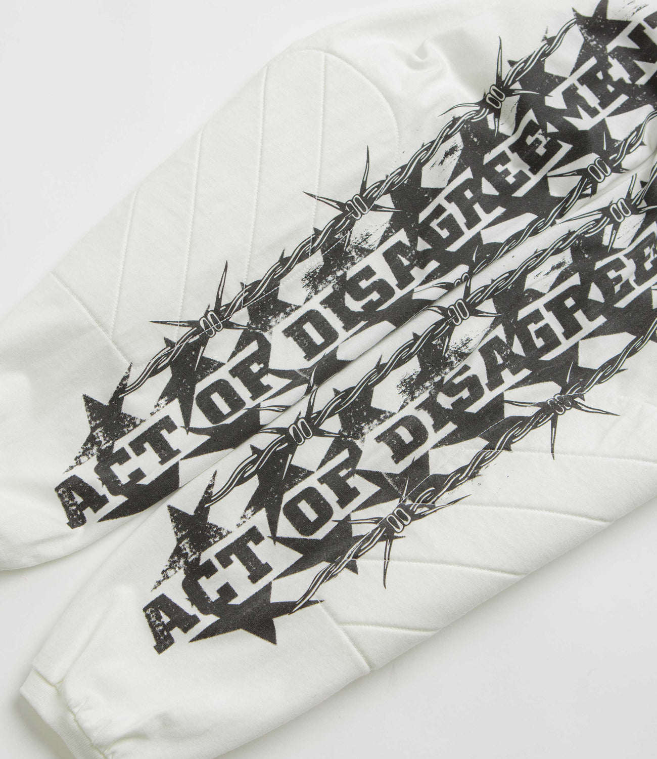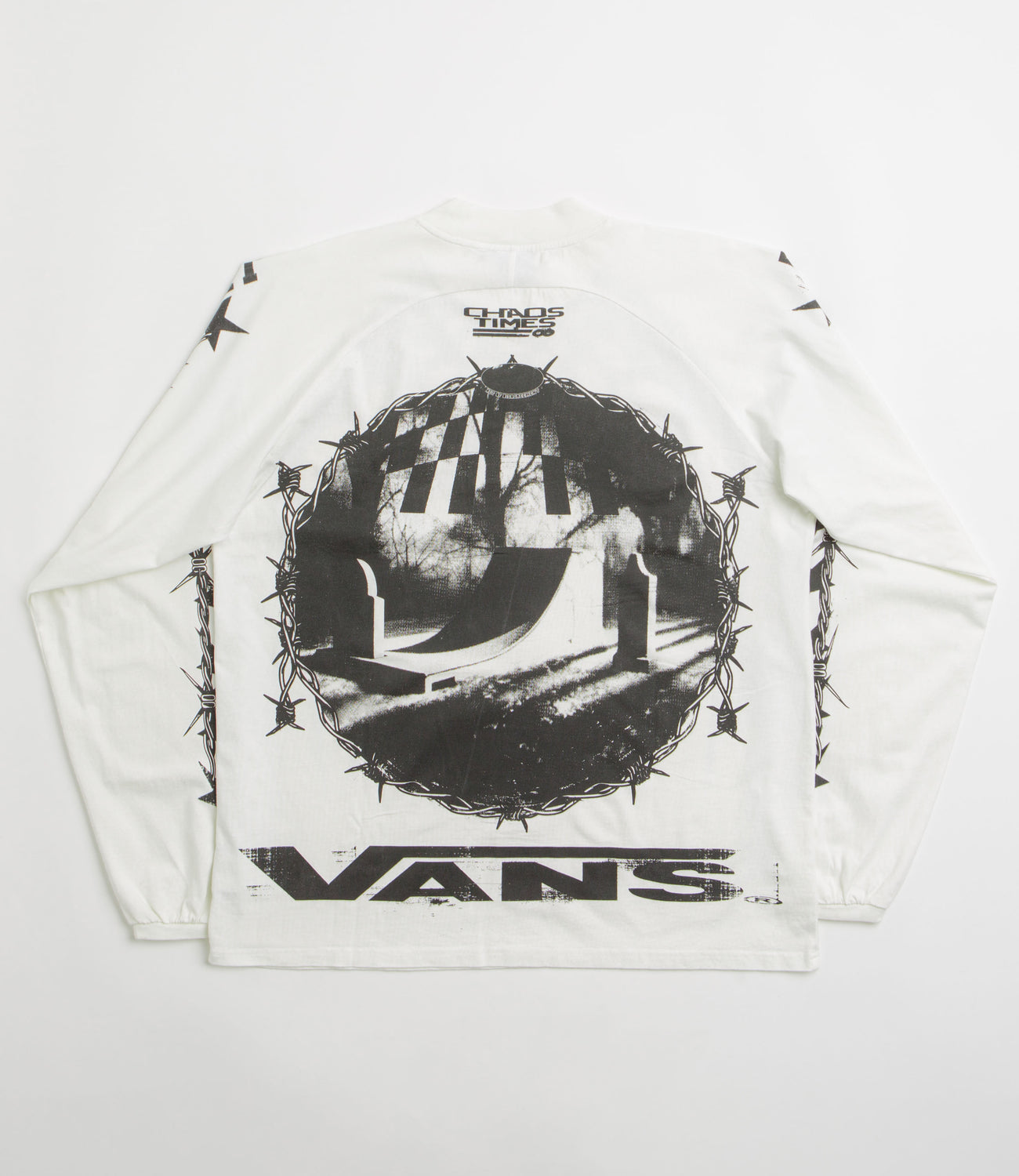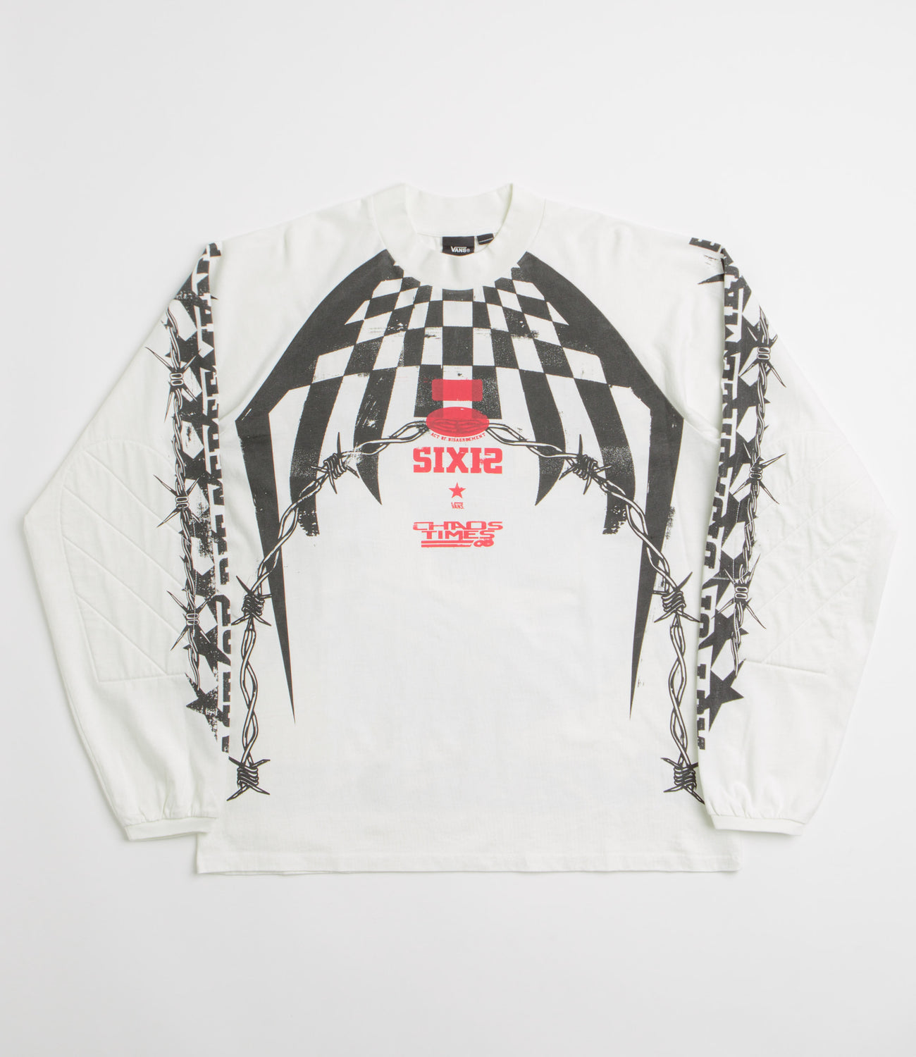 Vans x SlamJam AOD Hazard Long Sleeve T-Shirt in White. Oversized and made from 100% cotton, this Vans t-shirt is designed in collaboration with Act of Disagreement. Featuring a rib knit collar, raglan sleeves, elasticated cuffs and padded elbows, this white Vans t-shirt is finished with screen printed front and rear graphics.