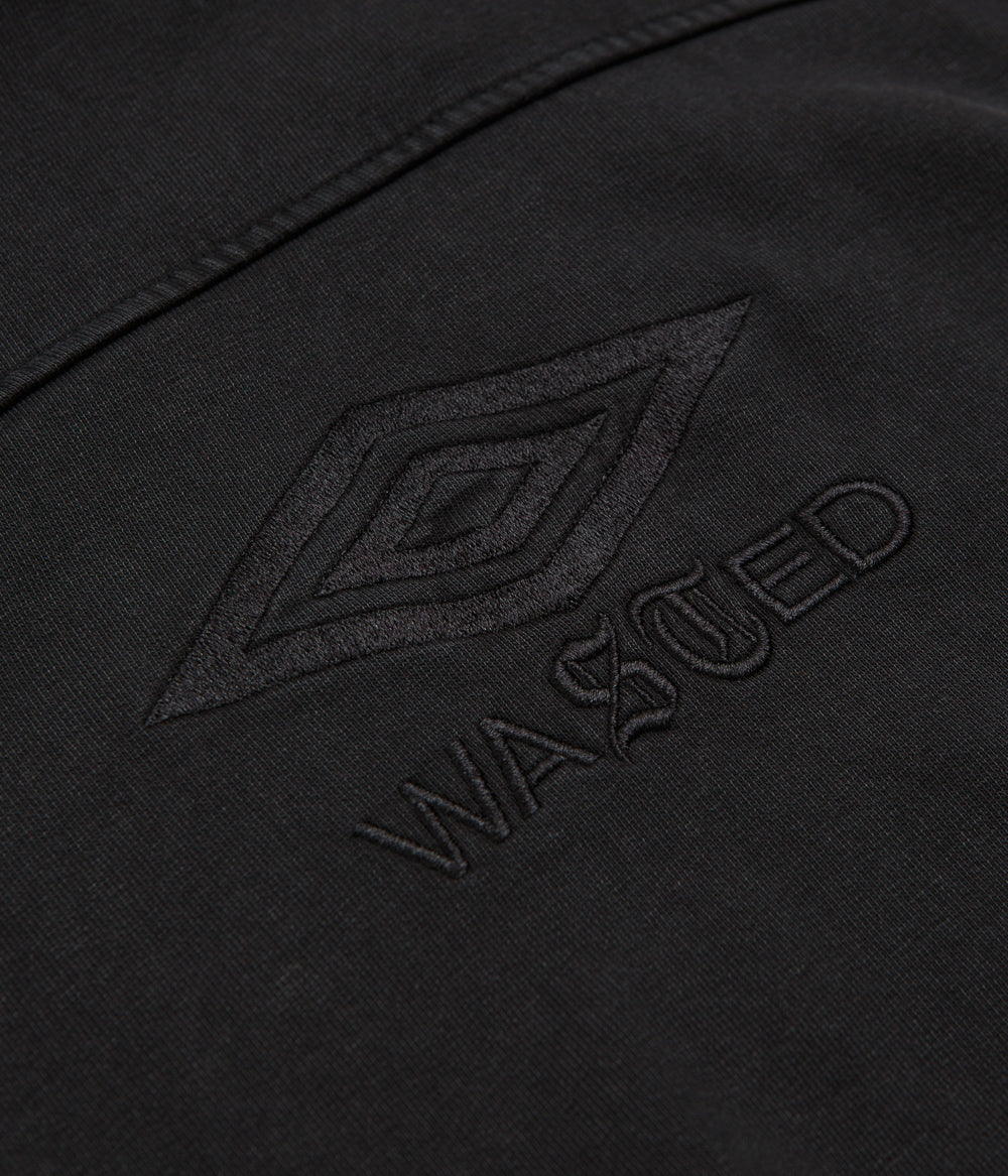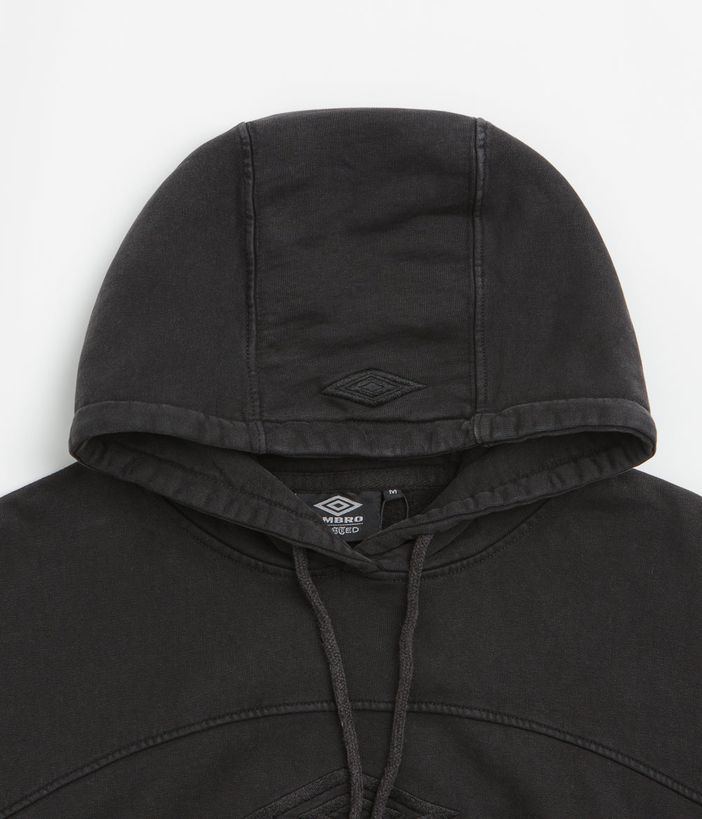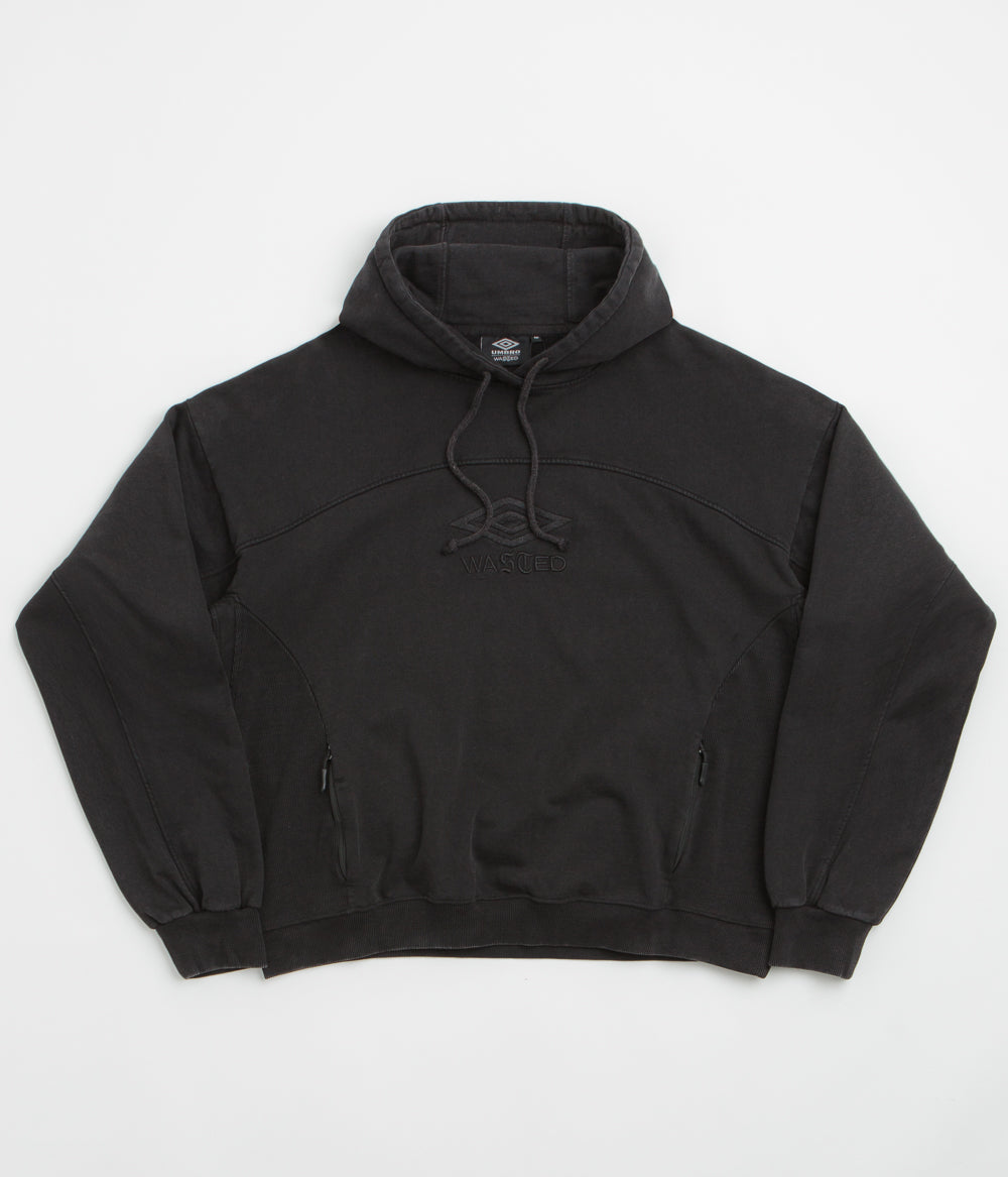 Wasted Paris x Umbro Boxy Hoodie in Faded Black. Boxy fitting with a panelled chest, this Wasted Paris hoodie is designed in collaboration with Umbro. Featuring an adjustable toggle-cord hood and zippered front pockets, this faded black Wasted Paris x Umbro hoodie is finished with ribbed cuffs and embroidered branding.