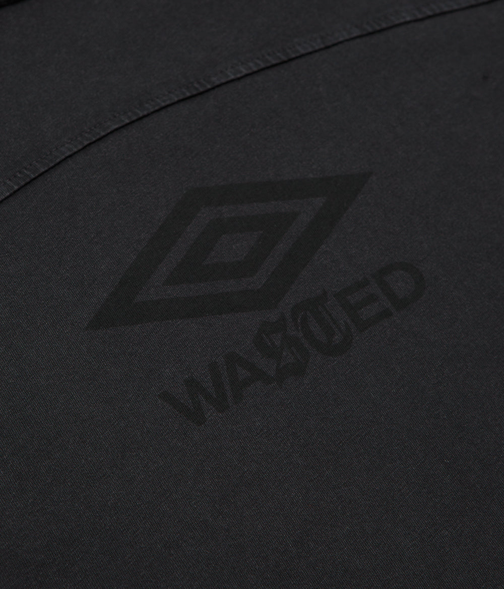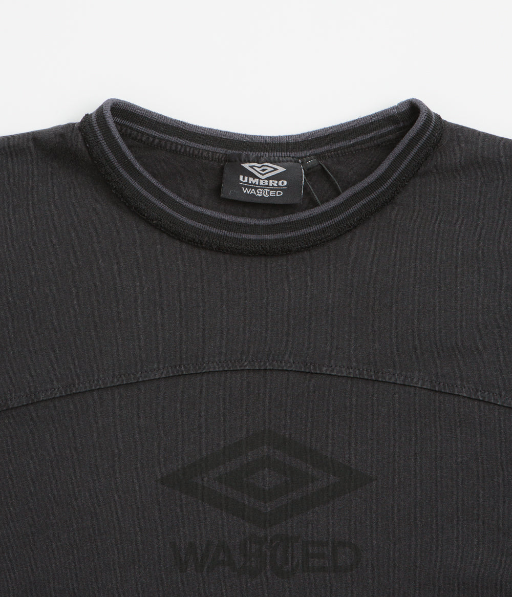 Wasted Paris x Umbro Boxy T-Shirt in Faded Black. Designed in collaboration with Umbro, this boxy fitting Wasted Paris t-shirt is made from 100% cotton. Featuring a rib knit collar and a panelled chest, this faded black Wasted Paris x Umbro t-shirt is finished with a printed chest graphic.