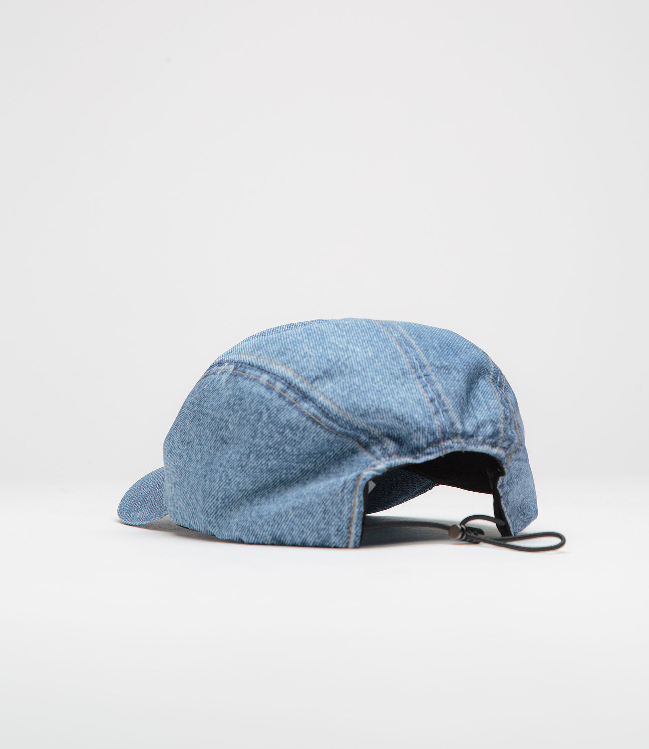 Wasted Paris x Umbro Trompe L'Oeil Track Cap in Washed Blue. Single sized and made from 100% polyester, this five panel Wasted cap is designed with a curved peak and piped seams. Designed in collaboration with Umbro and finished with an adjustable rear fastening and printed logos.