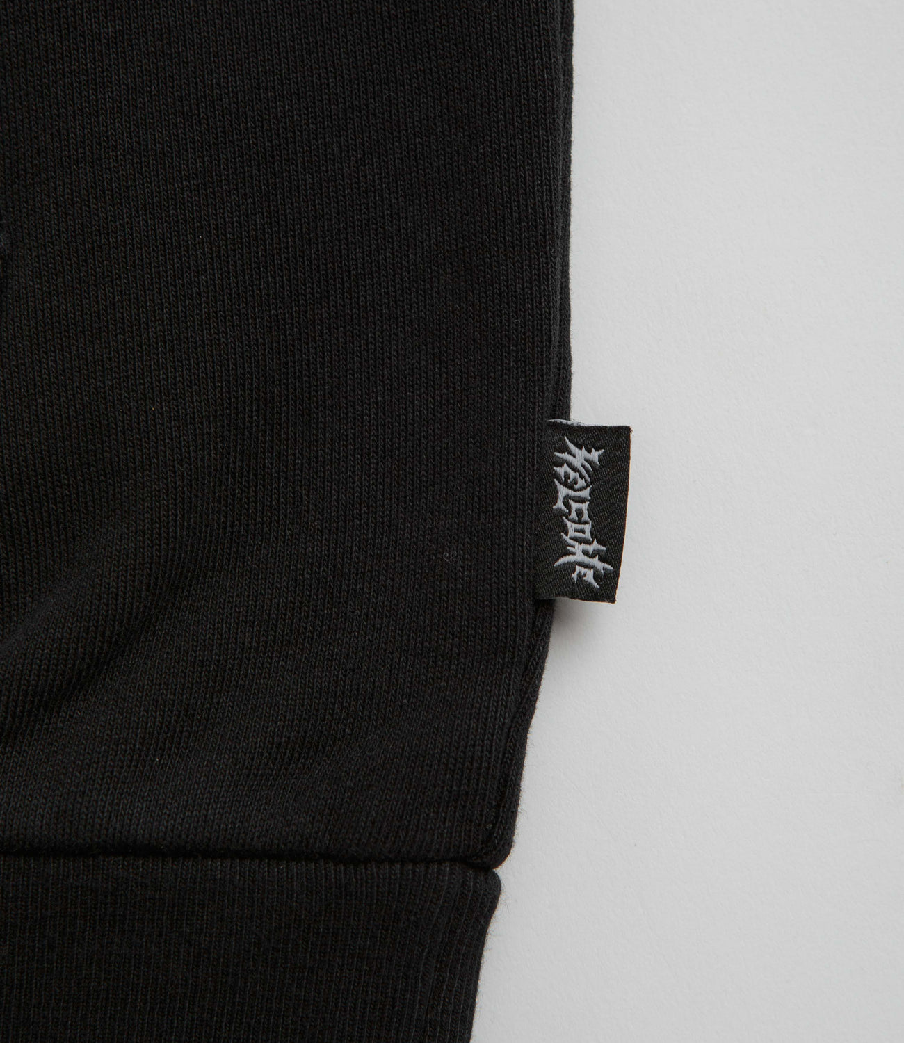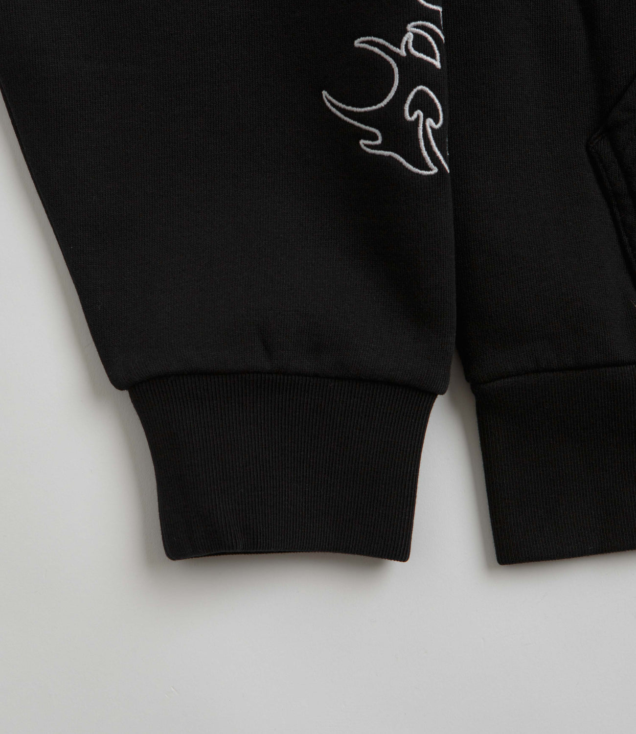 Welcome Barb Sleeve Embroidered Pigment-Dyed Hoodie in Black. Made from 100% cotton with a heavyweight pigment dyed construction, this regular fitting Welcome hoodie is designed with a drawstring adjustable hood. Featuring ribbed cuffs and a kangaroo front pocket, this black Welcome hoodie is finished with embroidered sleeves and a woven waist flag label.