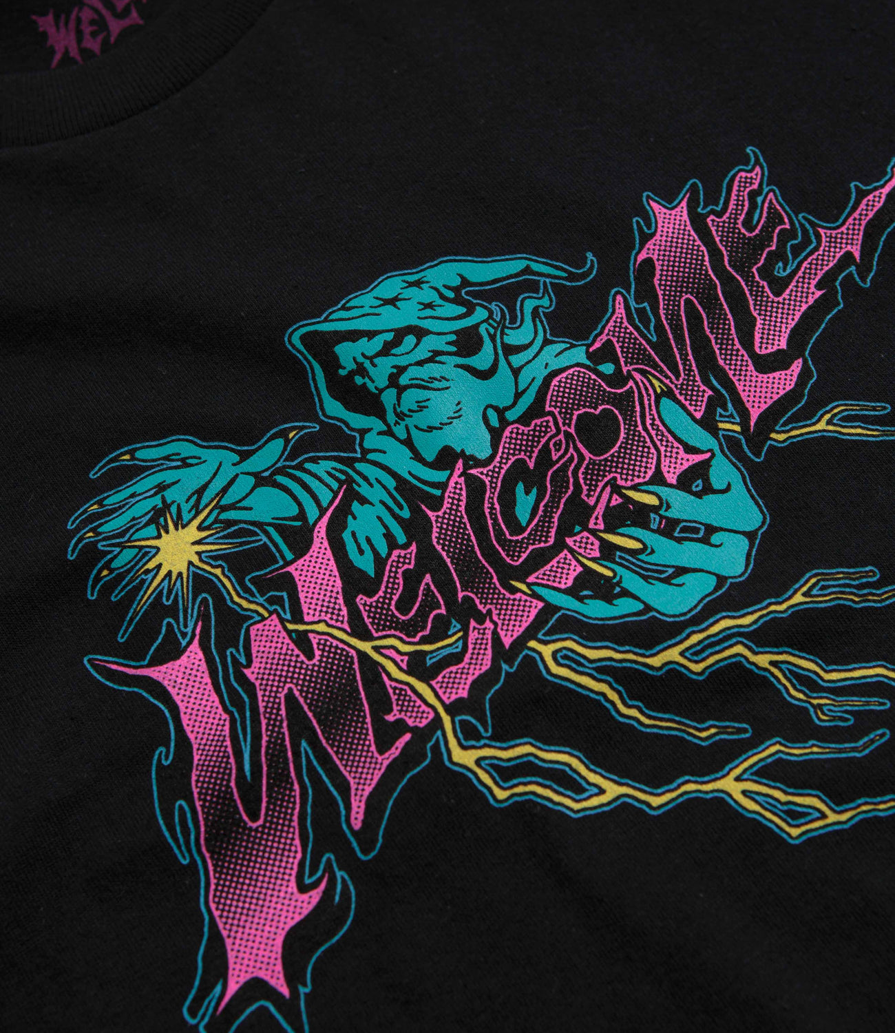 Welcome Magnetic T-Shirt in Black. Part of the brand’s latest release, this regular fitting Welcome t-shirt is made from 100% cotton. Featuring a classic crew collar and a reinforced hem, this black Welcome t-shirt is finished with a screen printed centre chest graphic.