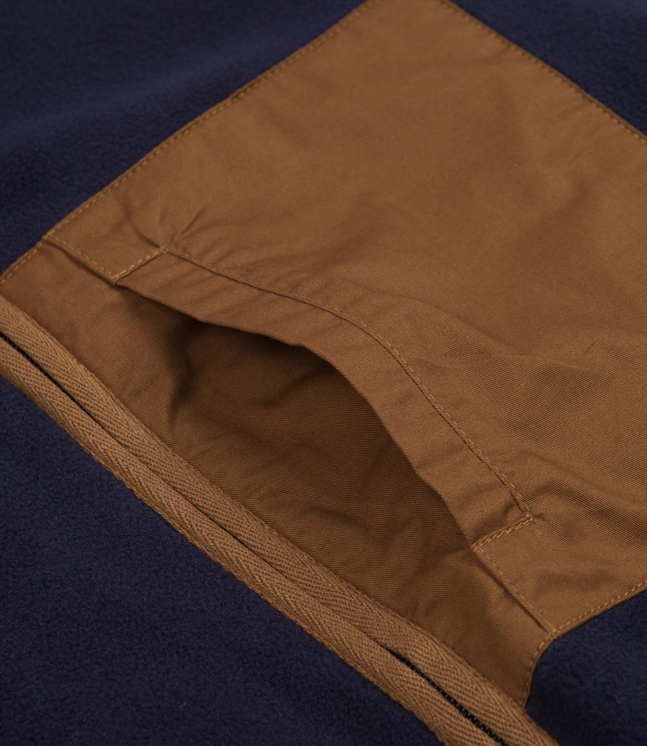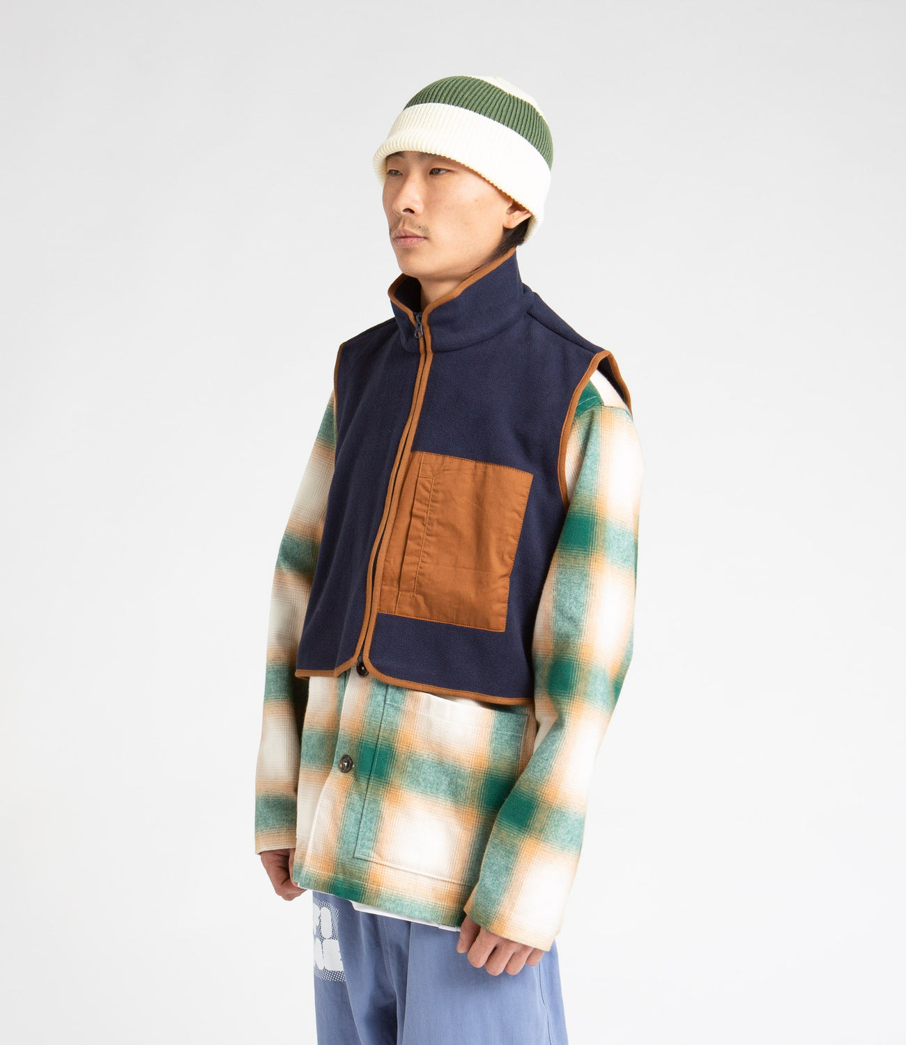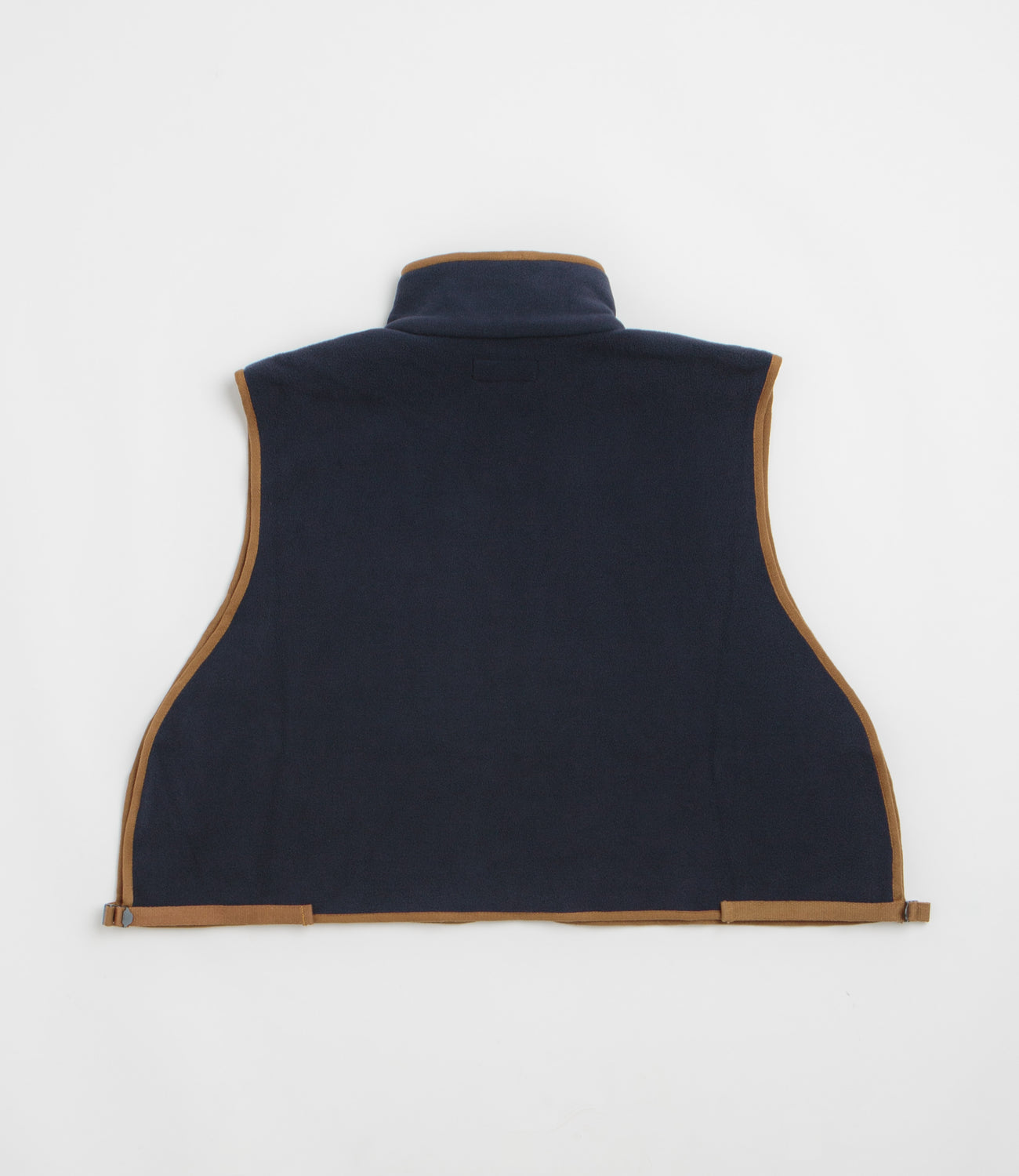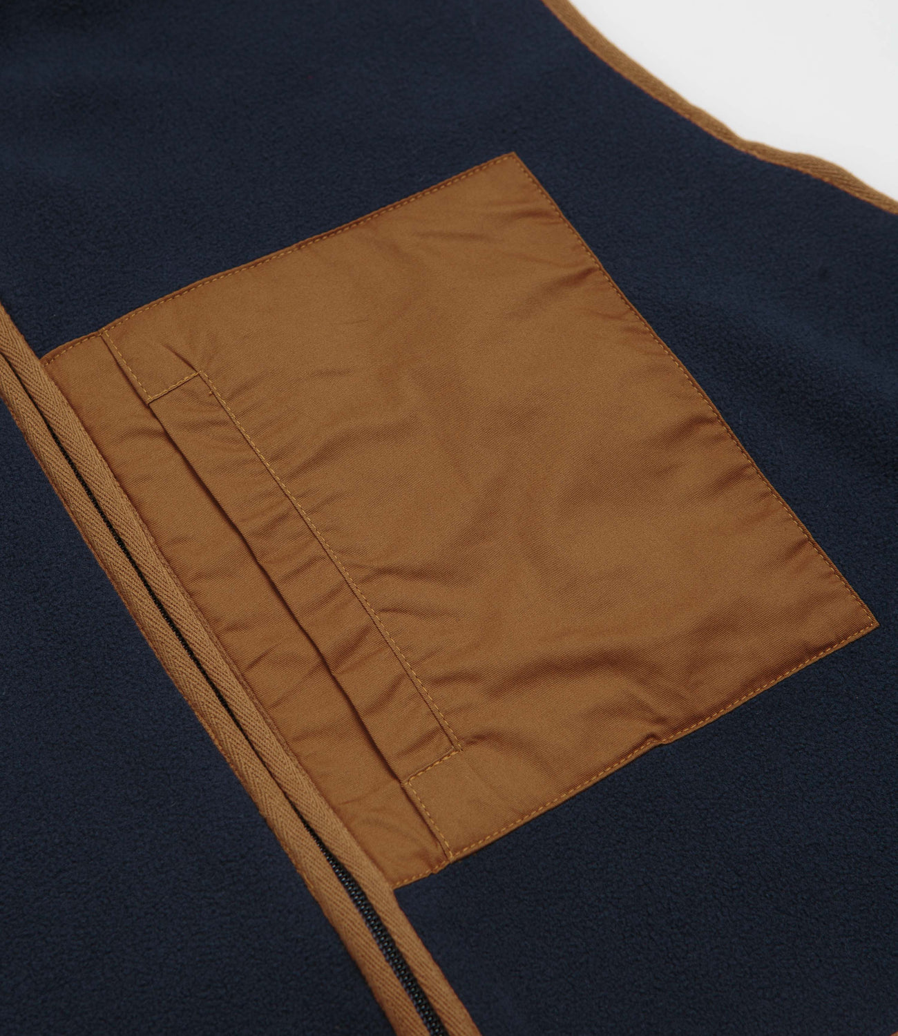 Workware Life Fleece Vest in Navy and Brown. Crafted from 100% polyester fleece and inspired by vintage stylings, this sleeveless Workware vest is tailored to a unisex fitting with a midweight construciton. Featuring a full length YKK zipper, a shortened profile, taped seams and buckle adjustable side straps, this navy Workware fleece vest is finished with a large contrast panel front pocket.