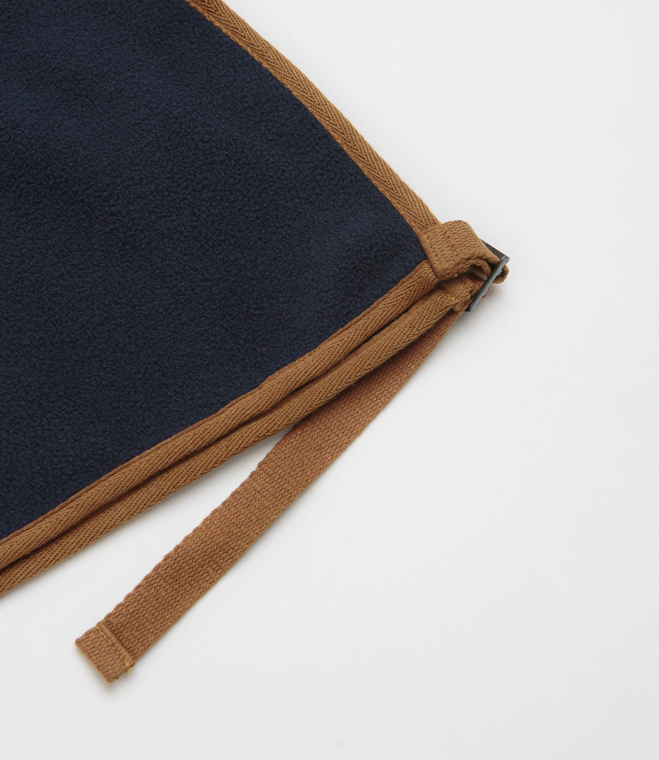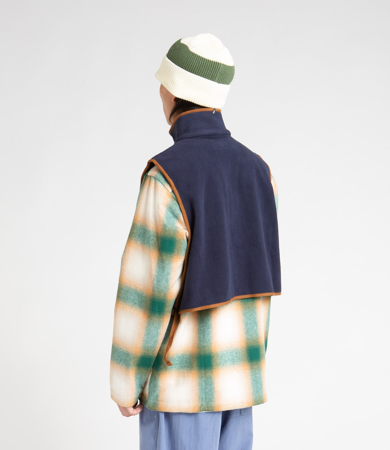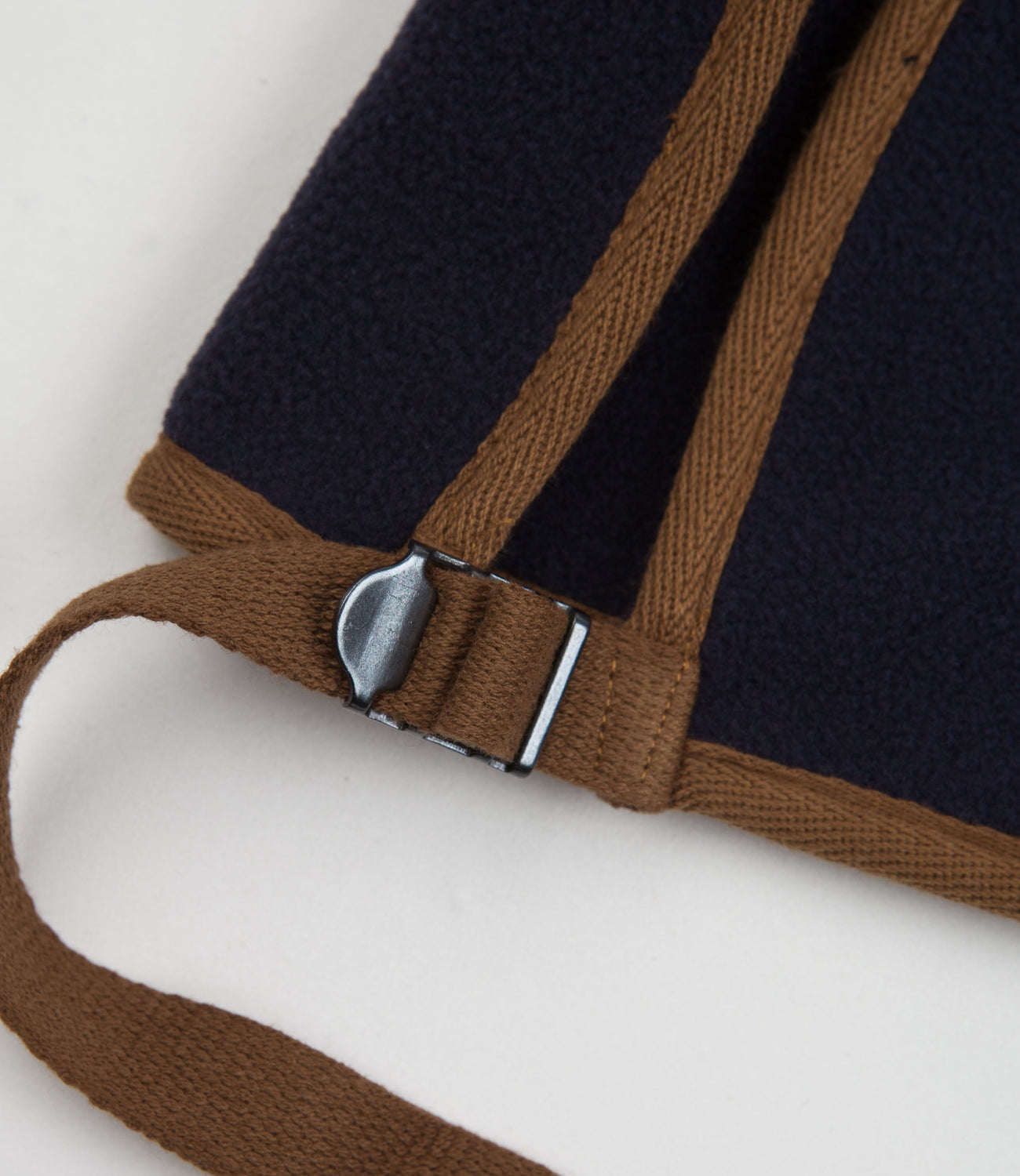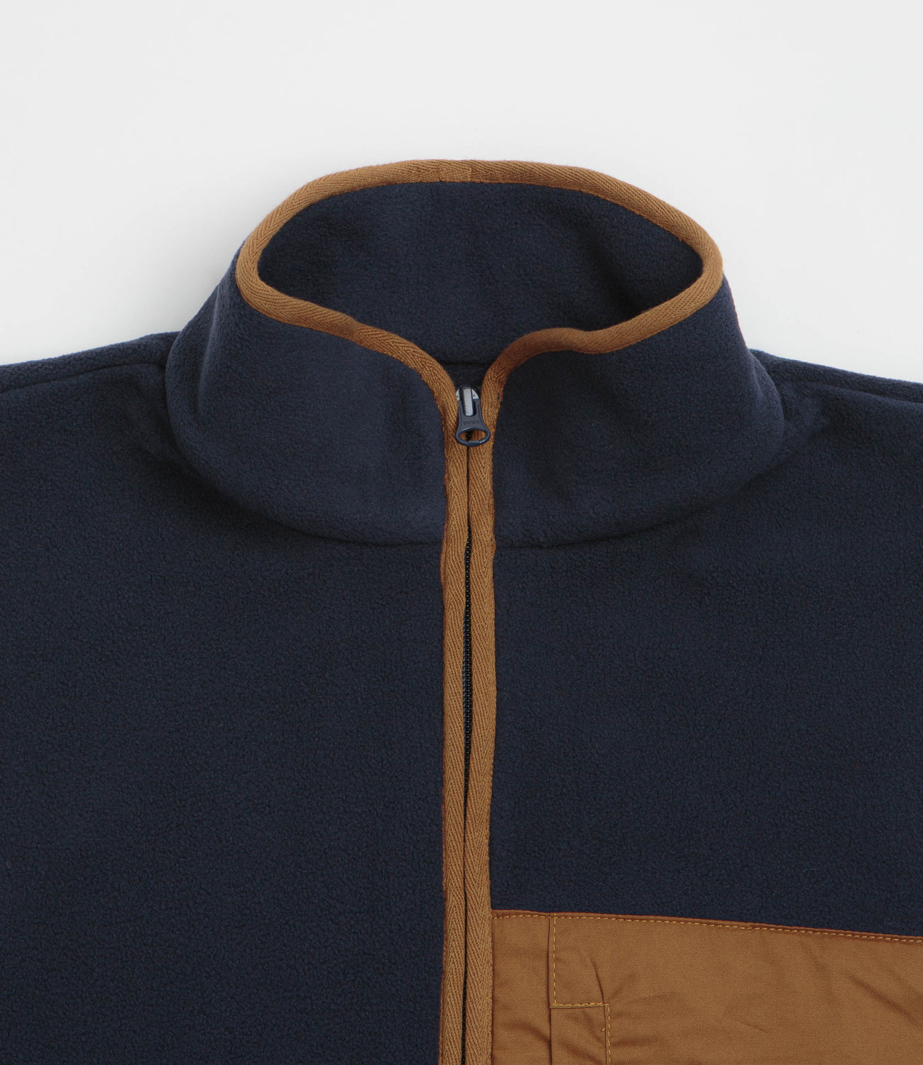 Workware Life Fleece Vest in Navy and Brown. Crafted from 100% polyester fleece and inspired by vintage stylings, this sleeveless Workware vest is tailored to a unisex fitting with a midweight construciton. Featuring a full length YKK zipper, a shortened profile, taped seams and buckle adjustable side straps, this navy Workware fleece vest is finished with a large contrast panel front pocket.