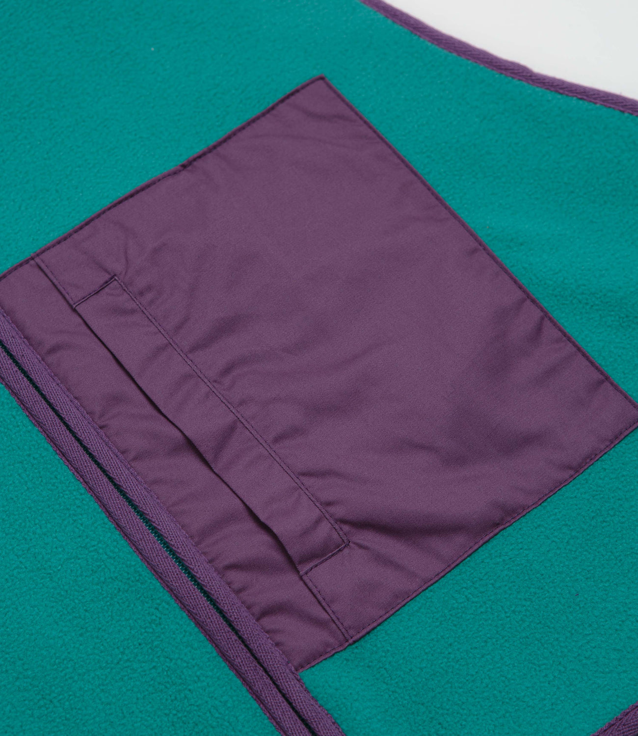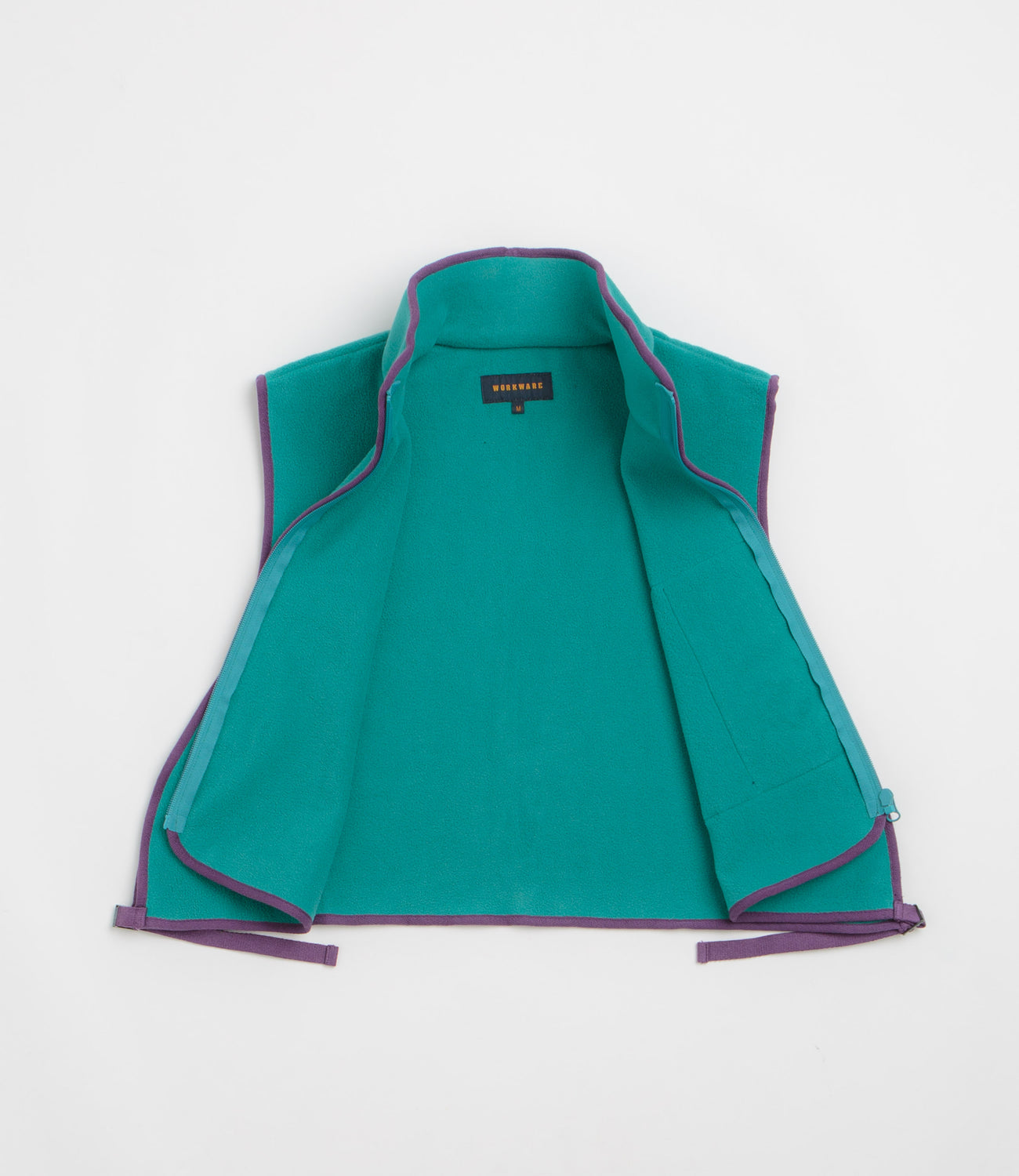 Workware Life Fleece Vest in Turquoise and Purple. Seen here in a two tone colourway inspired by vintage aesthetics, this sleeveless Workware vest is crafted from 100% polyester fleece and is tailored to a unisex fitting. Featuring open sides with adjustable straps, a full length YKK zipper, a shortened profile and taped seams, this turquoise Workware is finished with a single contrast panel front pocket.