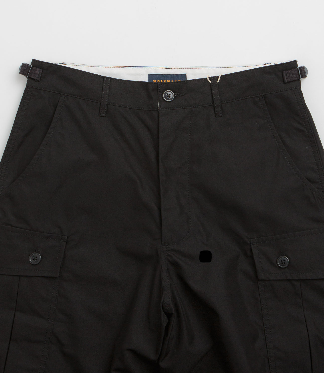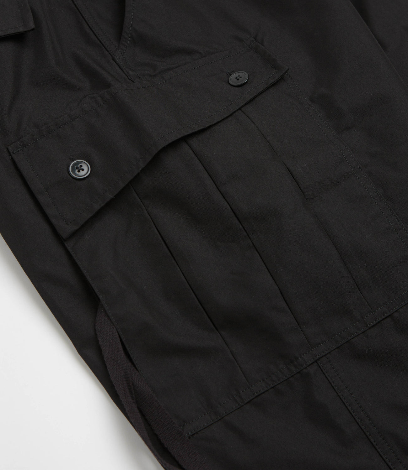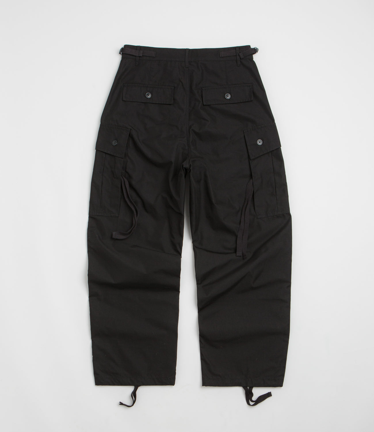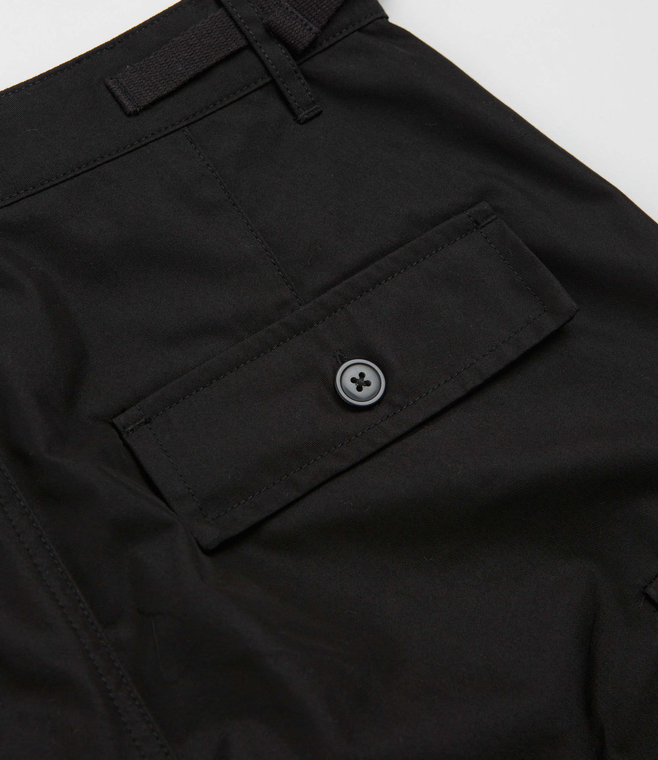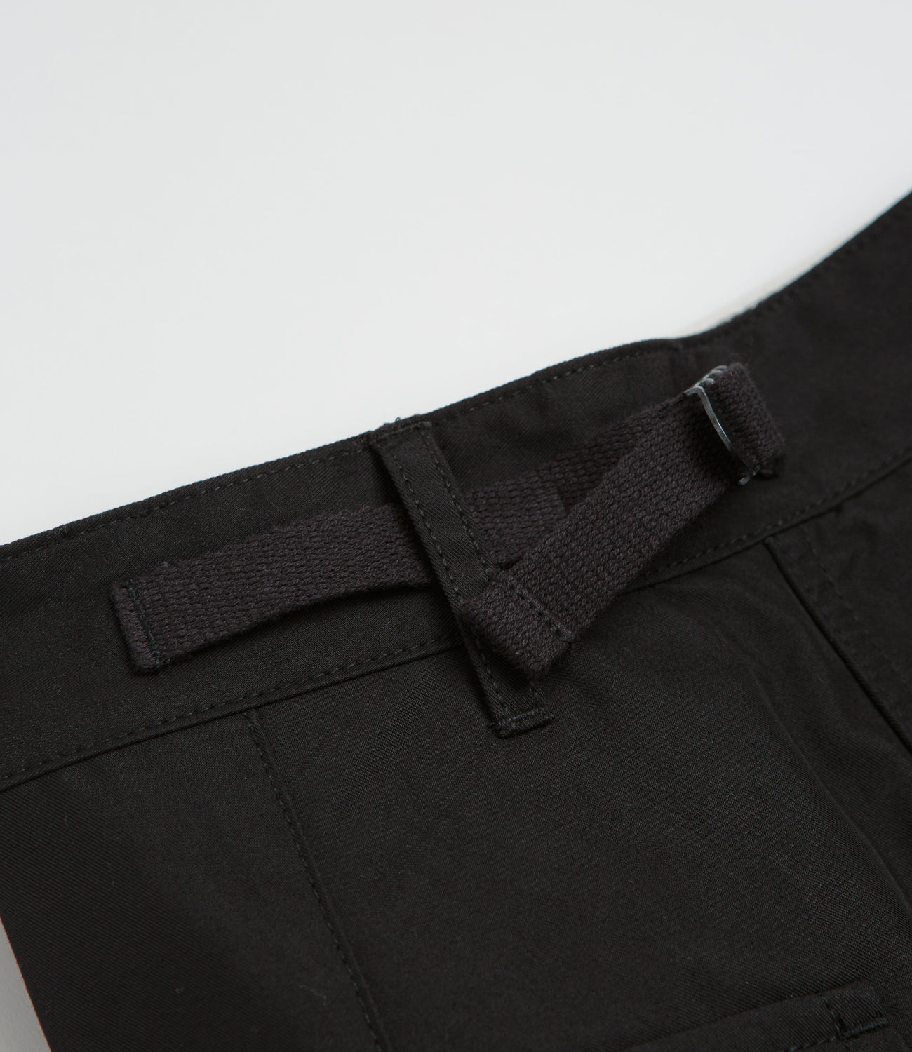 Workware Light M65 Pants in Black. Inspired by the US Army’s M65 silhouette, these relaxed and unisex fitting Workware pants are crafted from 100% cotton. Featuring an easy-dry fabrication, these black Workware pants also feature a button secured zipper fly, drawcord adjustable cuffs and emergency strap detailing. Finished with two front pockets, two rear pockets and with two buttoned cargo pockets sewn across each leg.