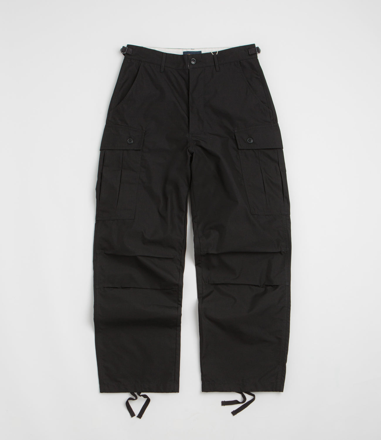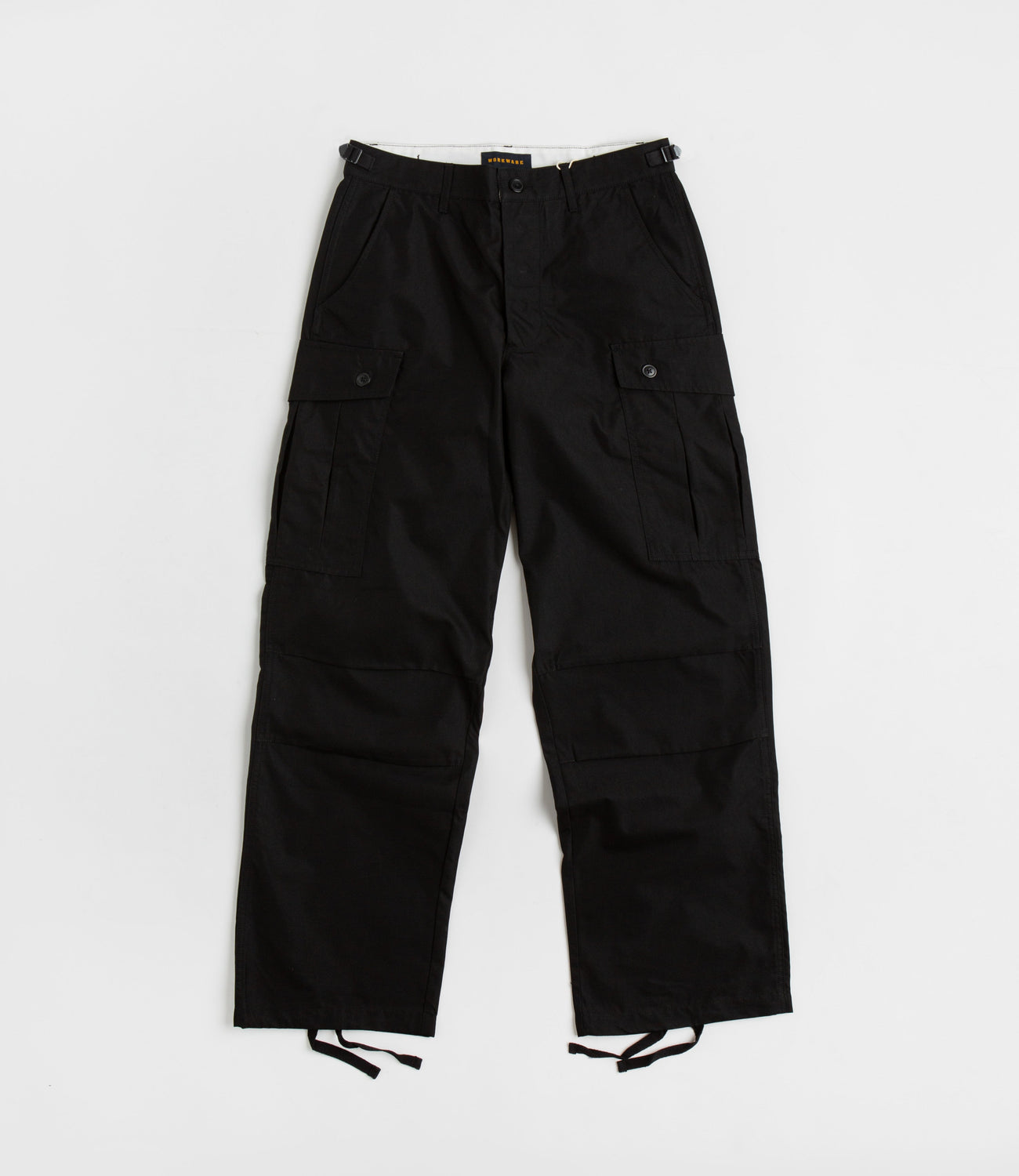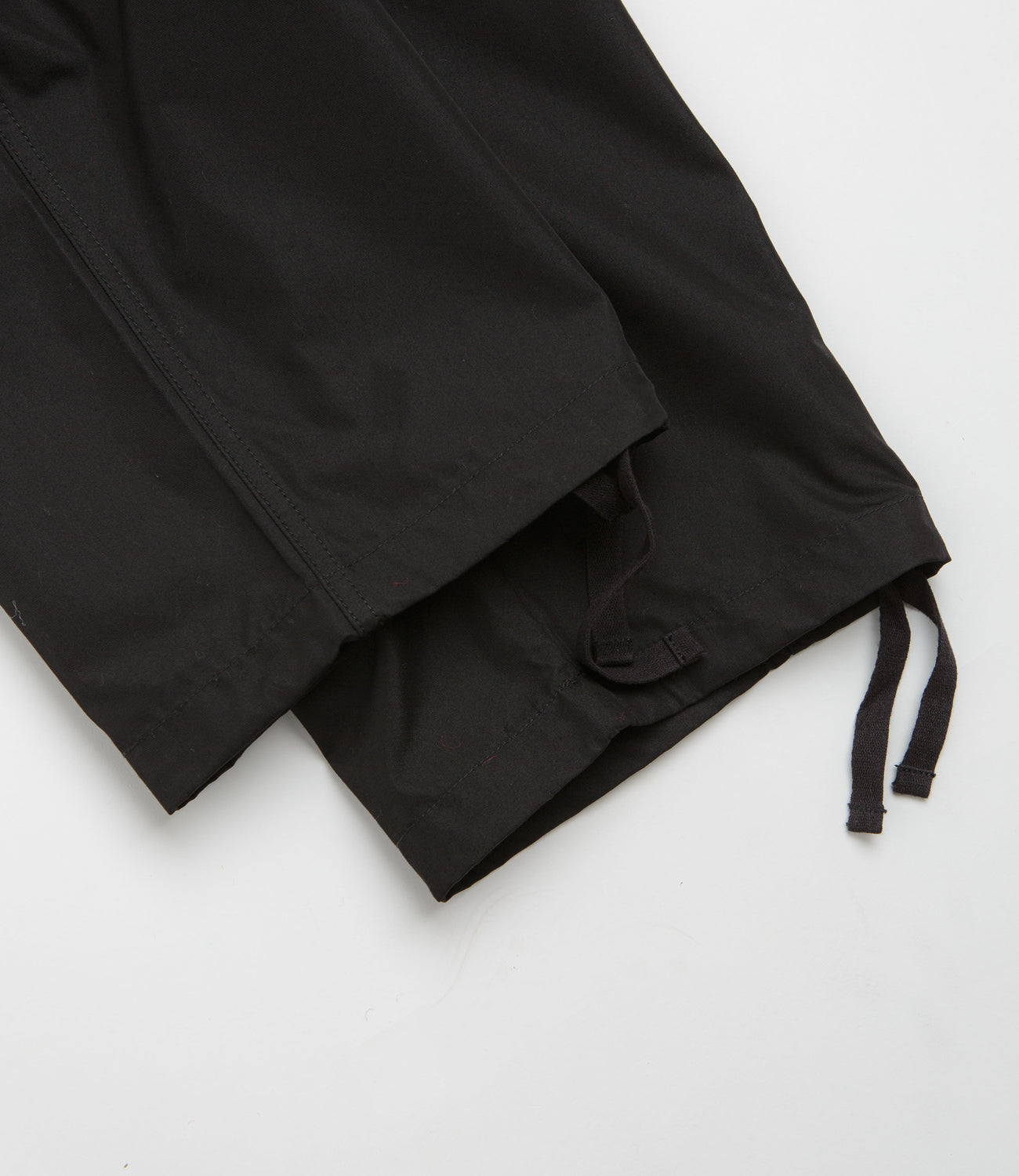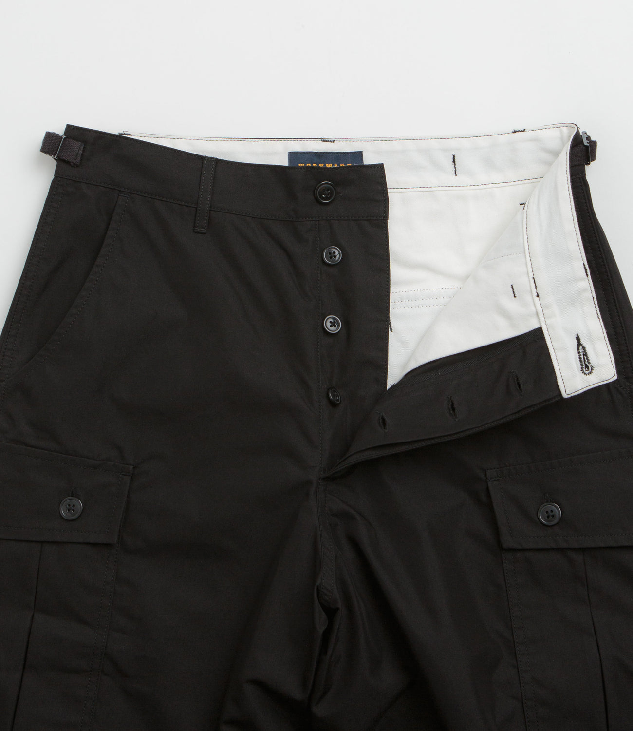 Workware Light M65 Pants in Black. Inspired by the US Army’s M65 silhouette, these relaxed and unisex fitting Workware pants are crafted from 100% cotton. Featuring an easy-dry fabrication, these black Workware pants also feature a button secured zipper fly, drawcord adjustable cuffs and emergency strap detailing. Finished with two front pockets, two rear pockets and with two buttoned cargo pockets sewn across each leg.