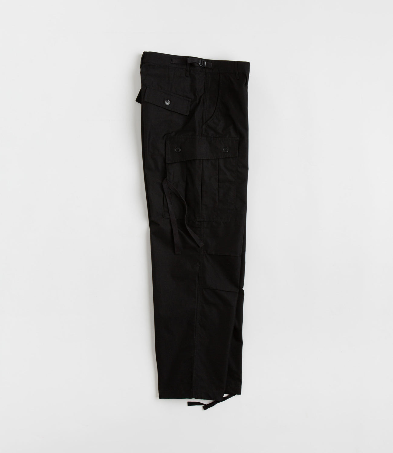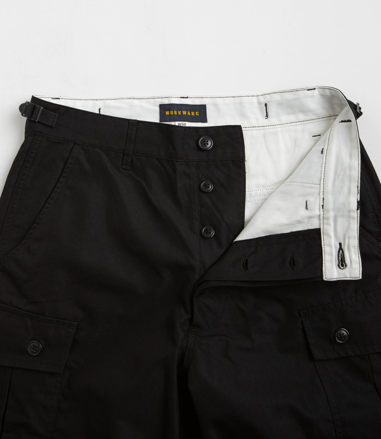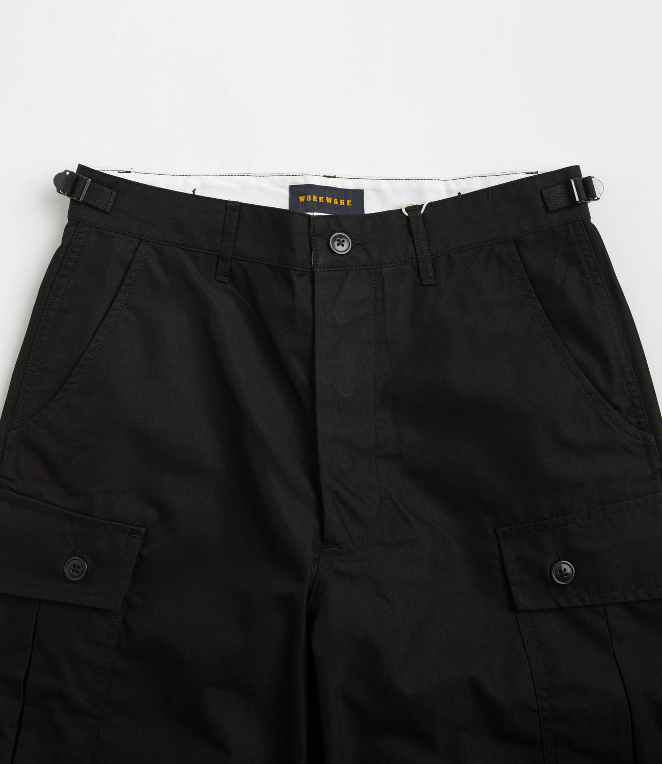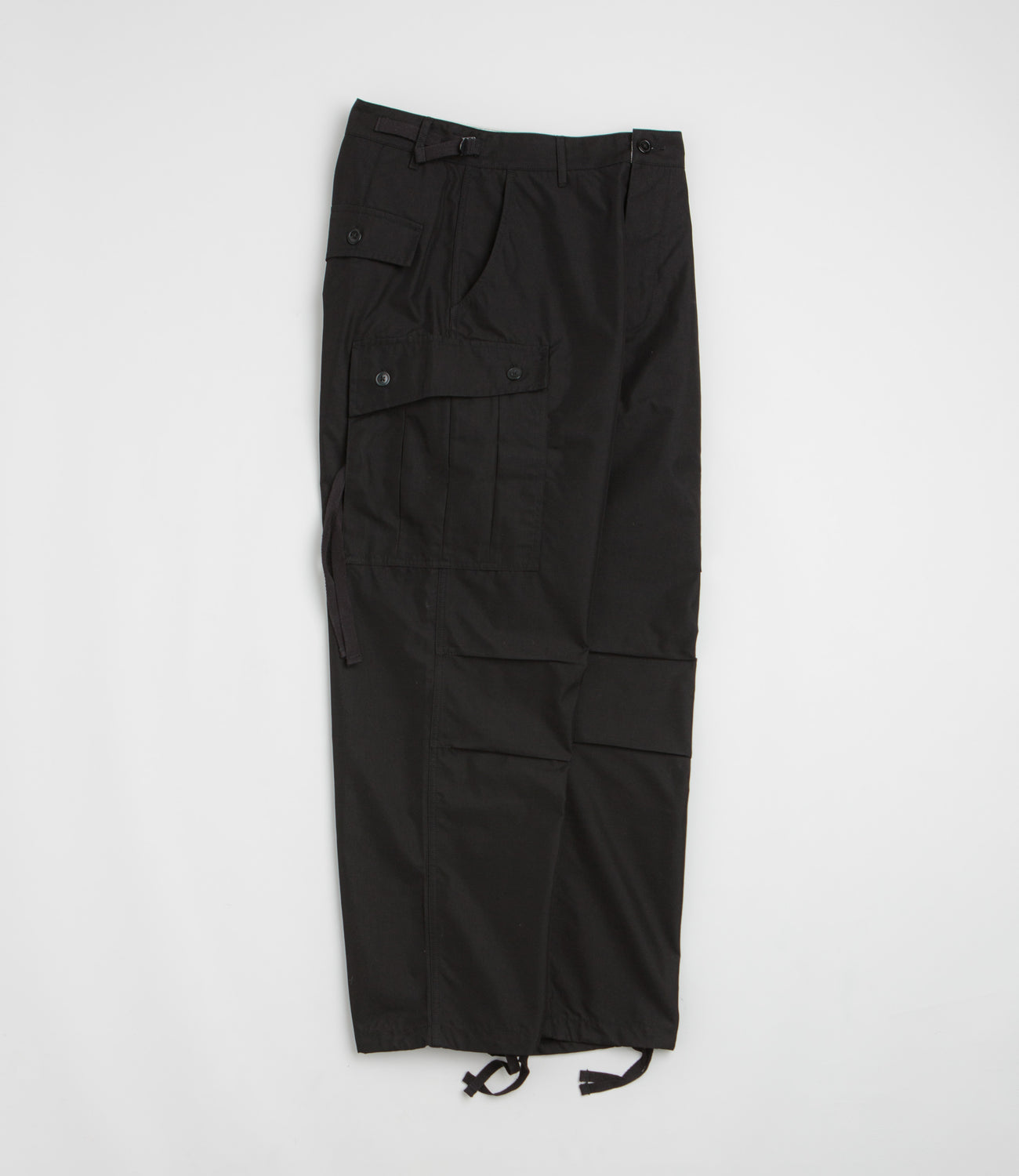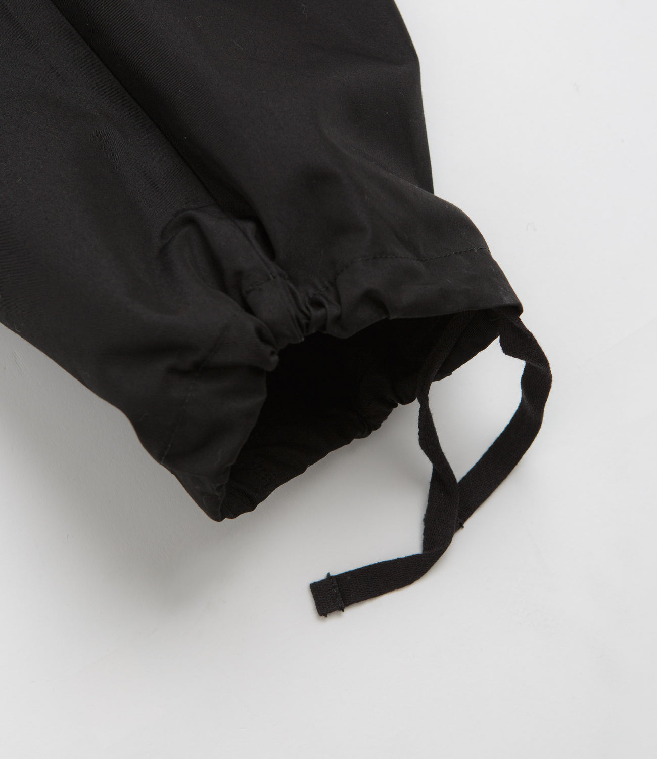 Workware Light M65 Pants in Black. Inspired by the US Army’s M65 silhouette, these relaxed and unisex fitting Workware pants are crafted from 100% cotton. Featuring an easy-dry fabrication, these black Workware pants also feature a button secured zipper fly, drawcord adjustable cuffs and emergency strap detailing. Finished with two front pockets, two rear pockets and with two buttoned cargo pockets sewn across each leg.