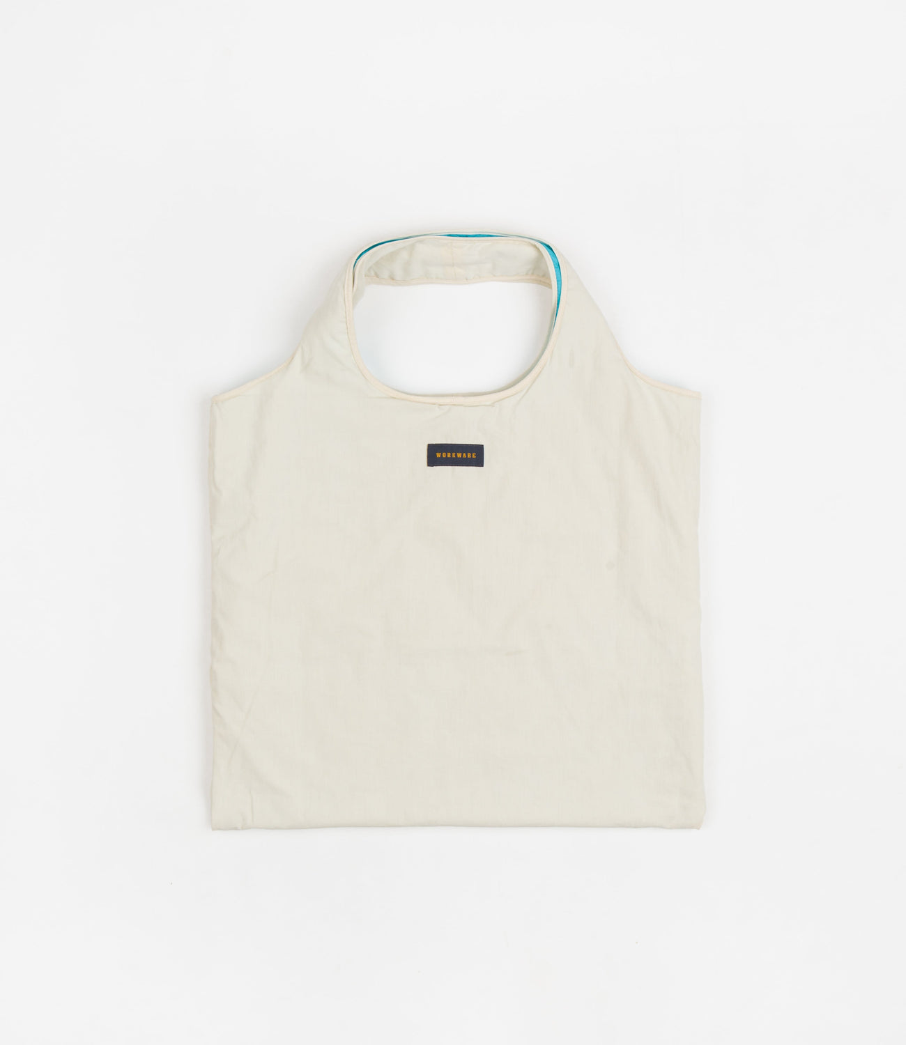 Workware Liner Tote Bag in Cyan. Styled in reversible shades of cyan and white, this quilted Workware tote is crafted from 100% cotton with a nylon lined inner. Featuring a drawcord fastening with an adjustable over-shoulder strap, this blue Workware tote bag is inspired by US Army shell jackets and is finished with a woven WHC leather tag.