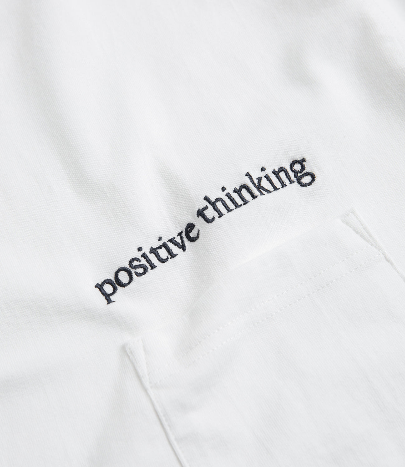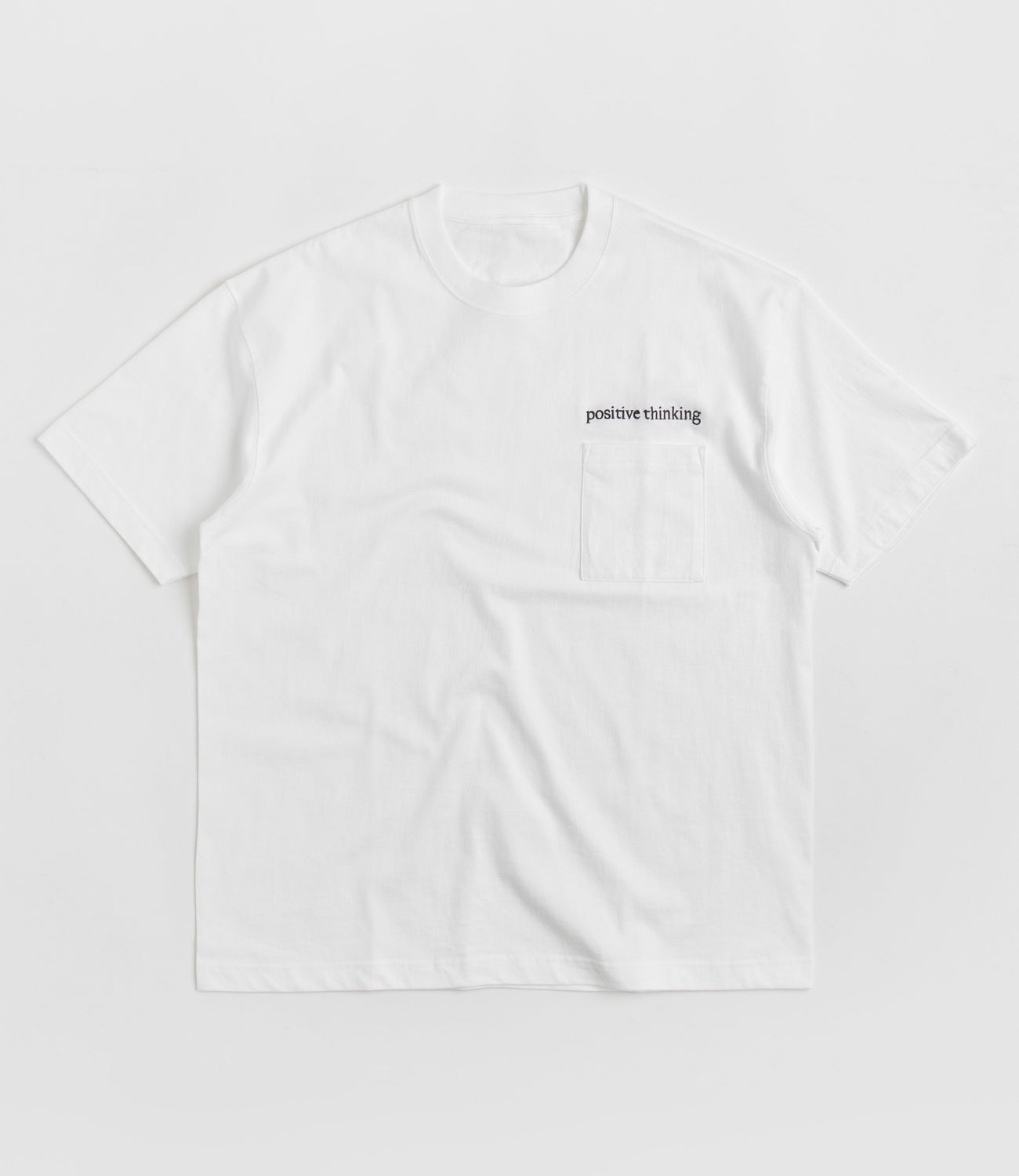 Workware Positive Thinking Heavyweight Pocket T-Shirt in White. Tailored to an oversized fitting, this heavyweight Workware t-shirt is crafted from 100% cotton with a tubular knit construction. Featuring a flexible rib knit collar and a boxy cut, this white Workware t-shirt is finished with a reinforced hem, a single left chest pocket and with embroidered Positive Thinking detailing.