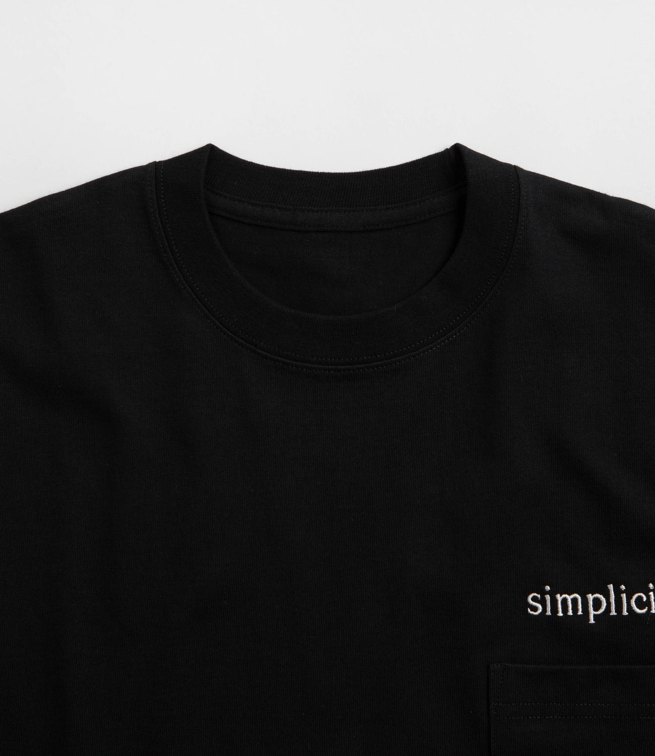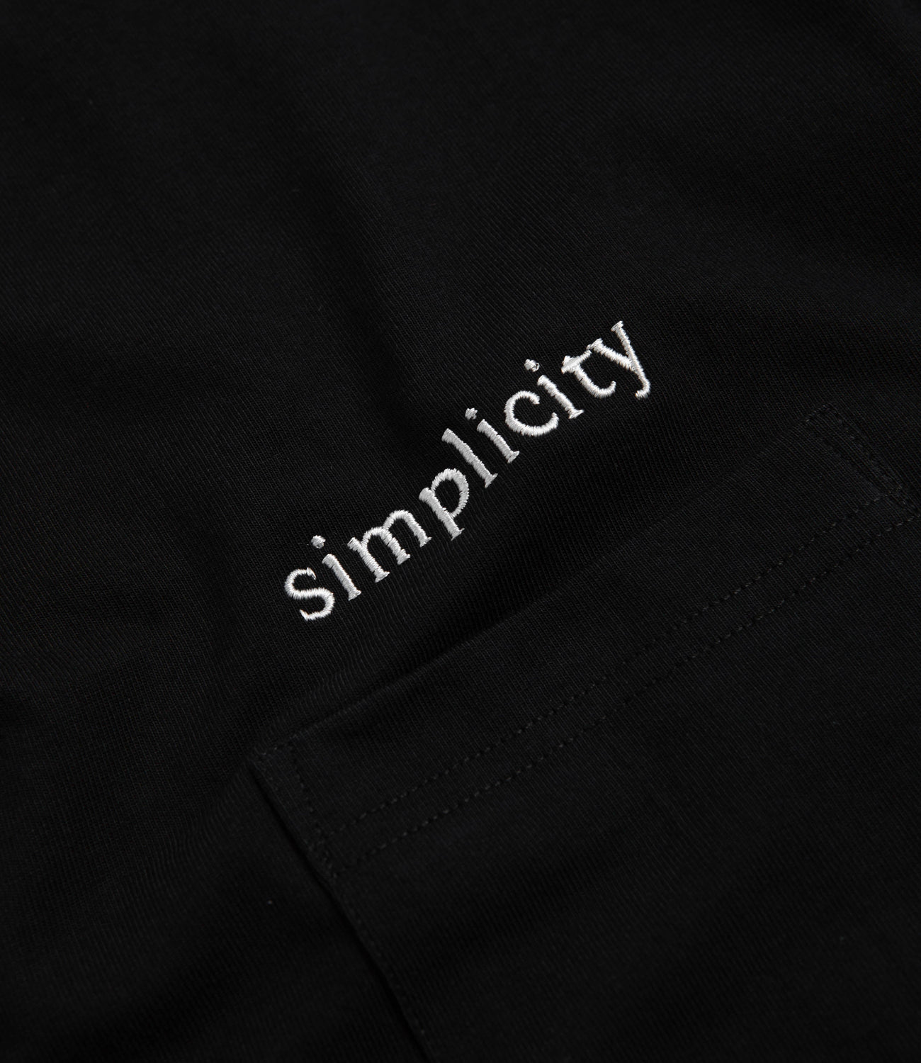 Workware Simplicity Heavyweight Pocket T-Shirt in Black. Oversized and styled with a boxy cut, this colour block Workware t-shirt is crafted from 100% cotton with a tubular knit construction. Featuring a flexible rib knit collar and a reinforced hem, this heavyweight black Workware t-shirt is finished with a single left chest pocket with embroidered Simplicity branding.