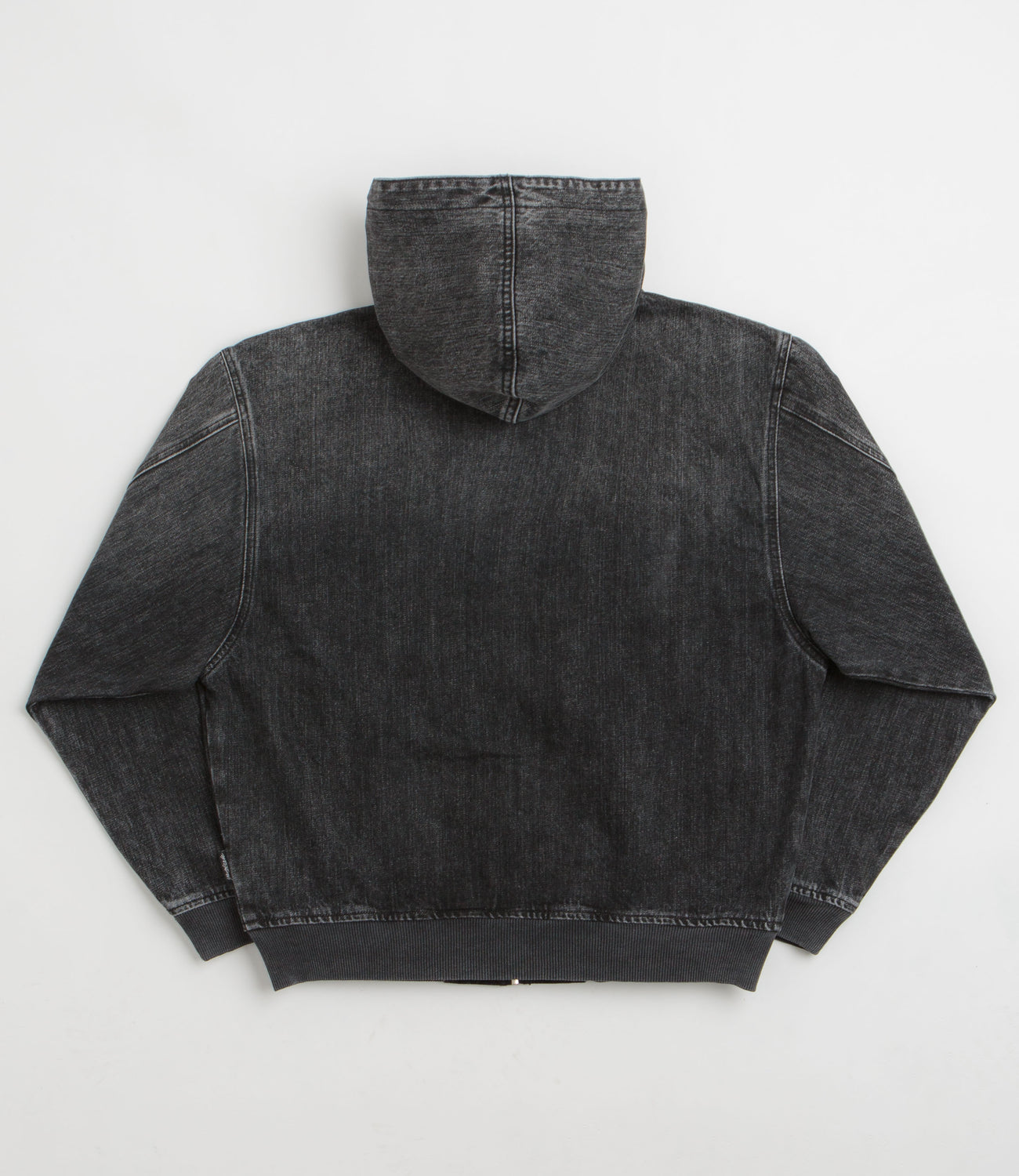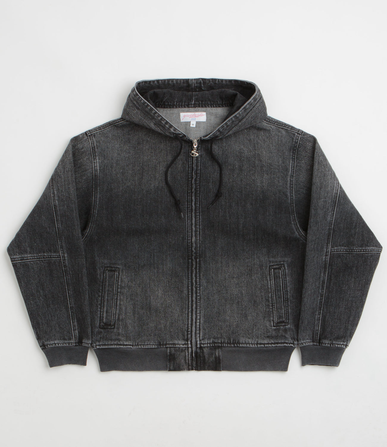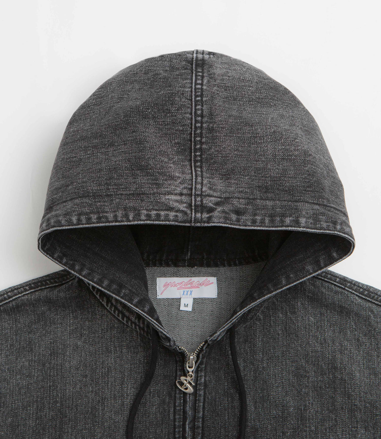 Yardsale Denim Full Zip Hoodie in Black. Regular fitting with faded patches, this Yardsale hoodie is made from 100% cotton denim. Featuring an adjustable drawcord hood, a full length zipper fastening and a custom YS zip pull, this black Yardsale hoodie is finished with two front pockets, ribbed cuffs and a woven elastic hem.