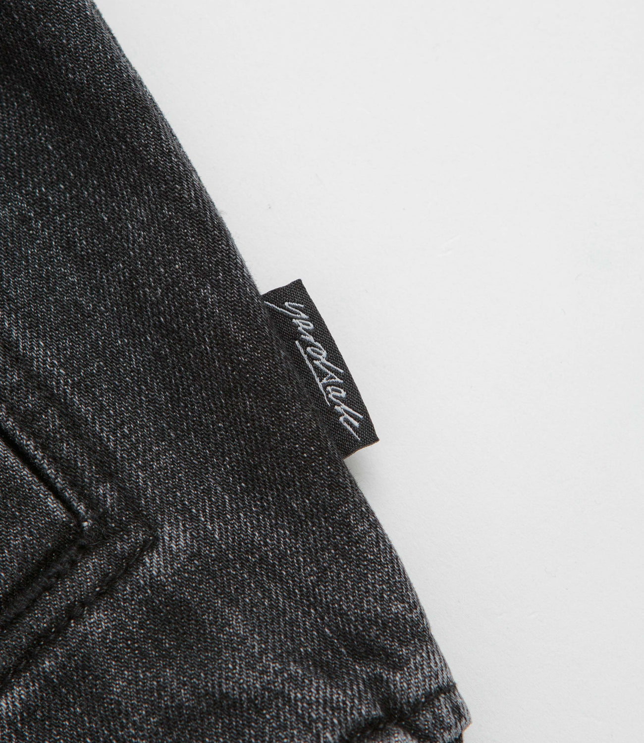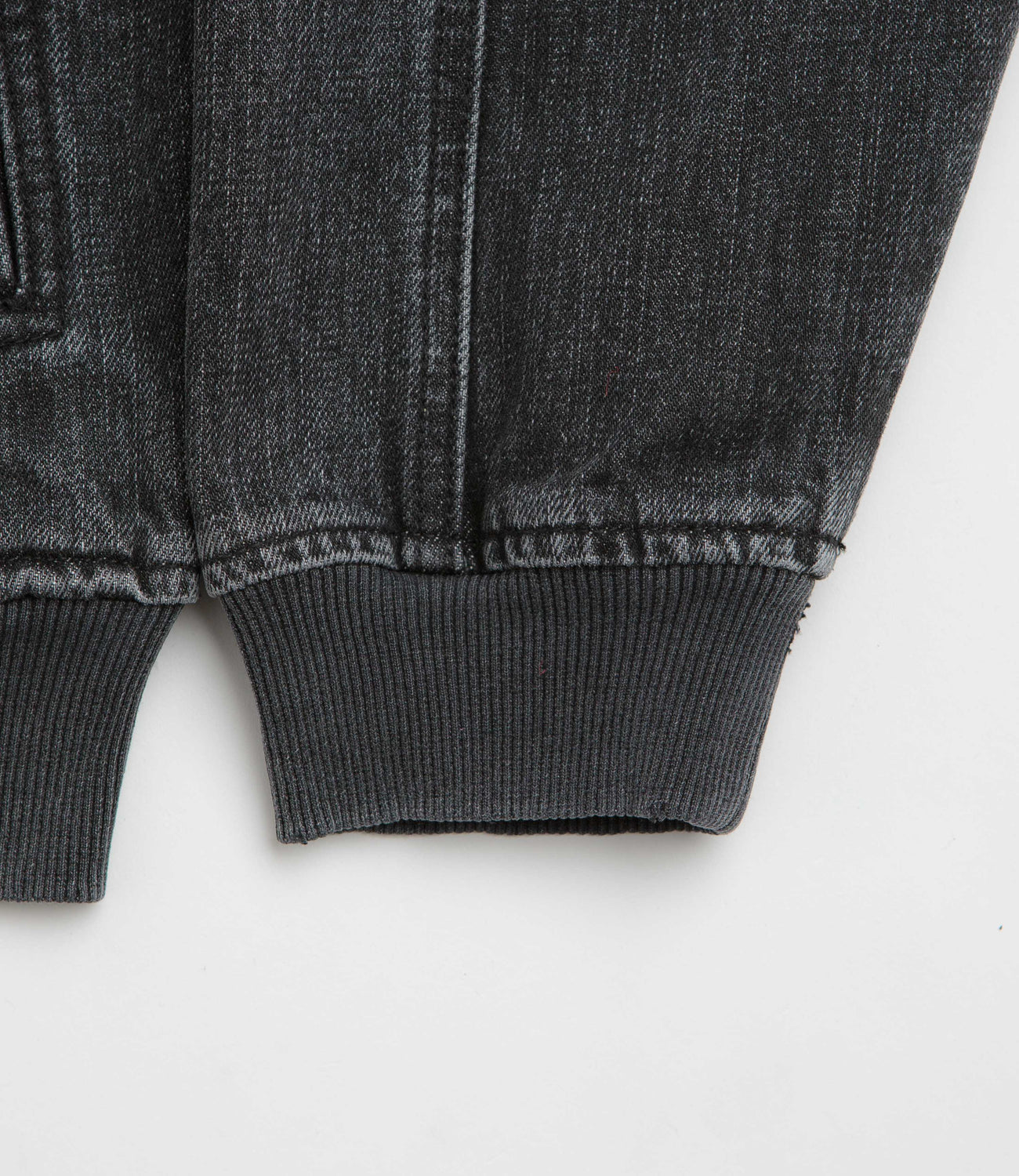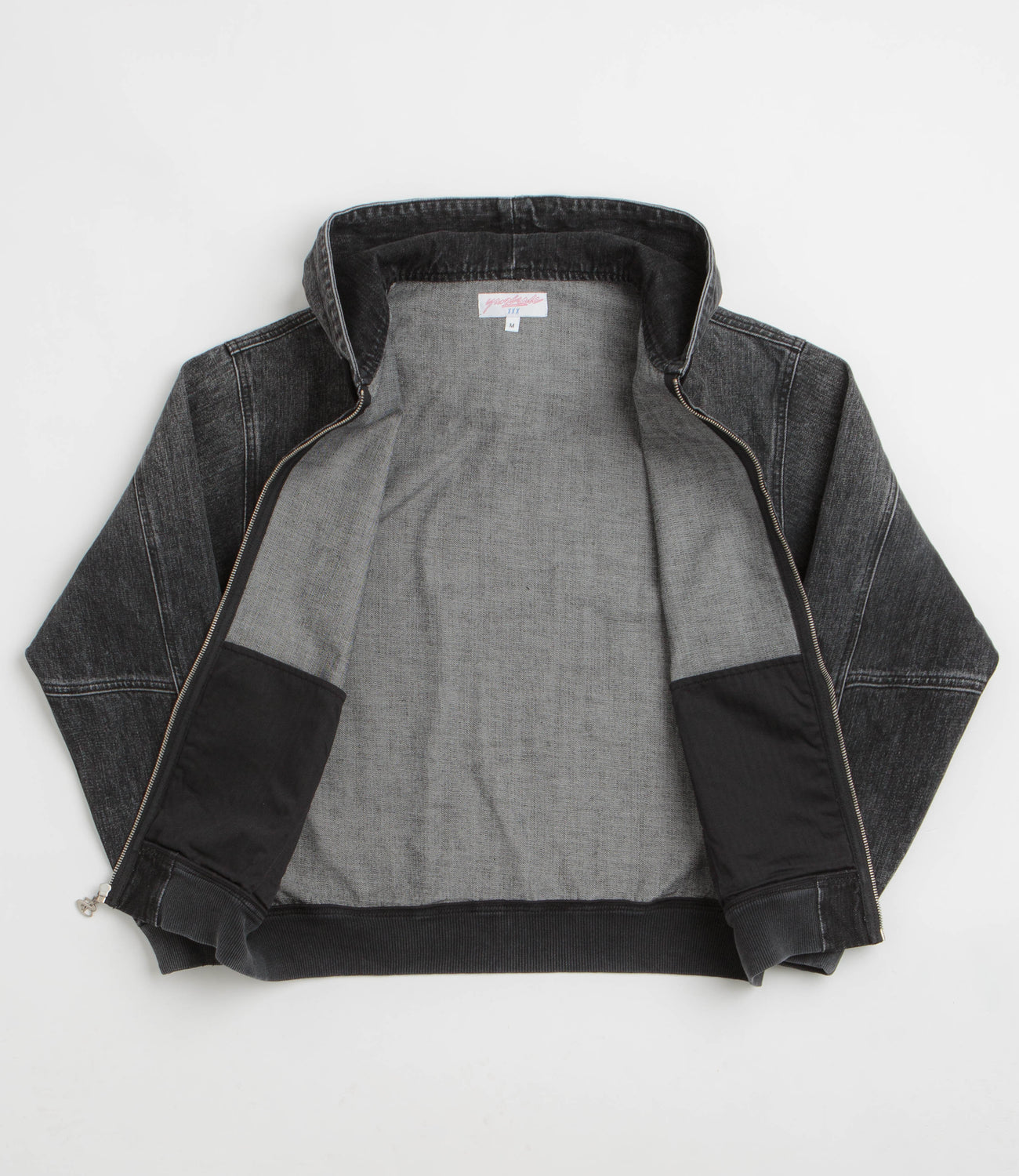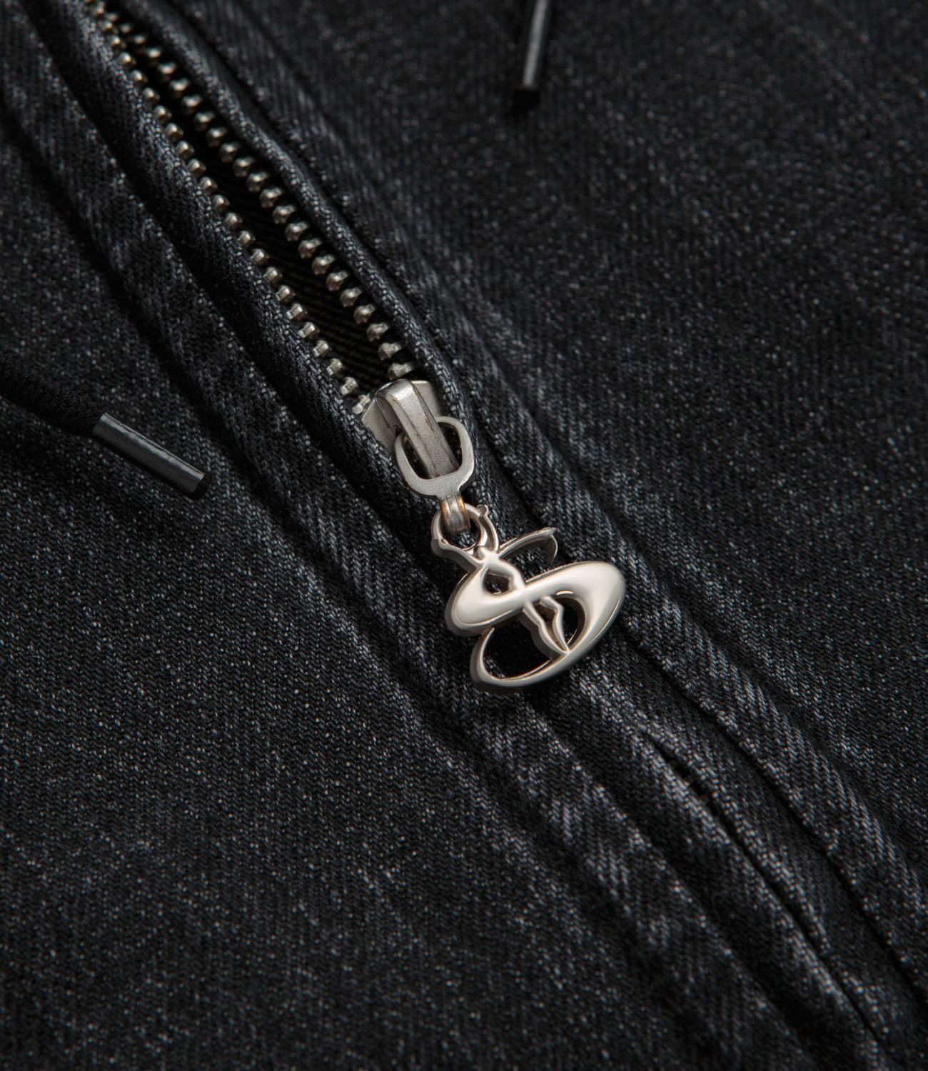 Yardsale Denim Full Zip Hoodie in Black. Regular fitting with faded patches, this Yardsale hoodie is made from 100% cotton denim. Featuring an adjustable drawcord hood, a full length zipper fastening and a custom YS zip pull, this black Yardsale hoodie is finished with two front pockets, ribbed cuffs and a woven elastic hem.