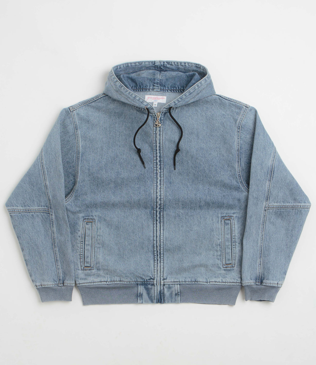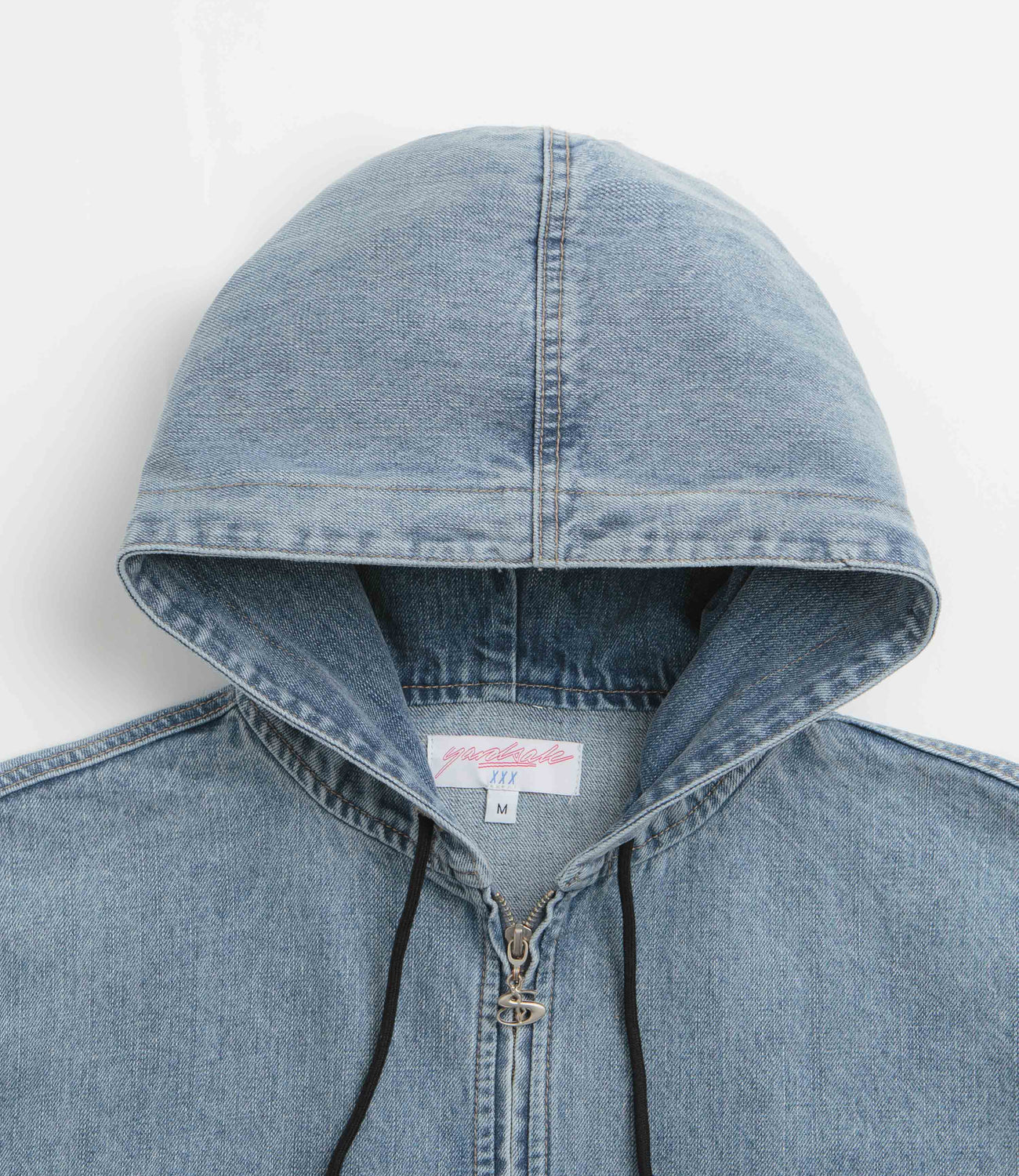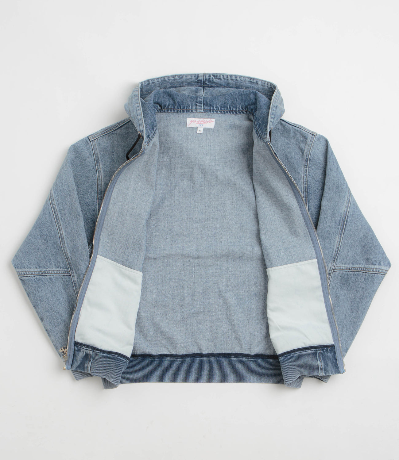 Yardsale Denim Full Zip Hoodie in Blue. Detailed with faded patches, this regular fitting Yardsale hoodie is made from 100% cotton denim. Featuring an adjustable drawcord hood, a full length zipper fastening and a custom YS zip pull, this blue Yarsdale hoodie is finished with two front pockets, ribbed cuffs and a woven elastic hem.