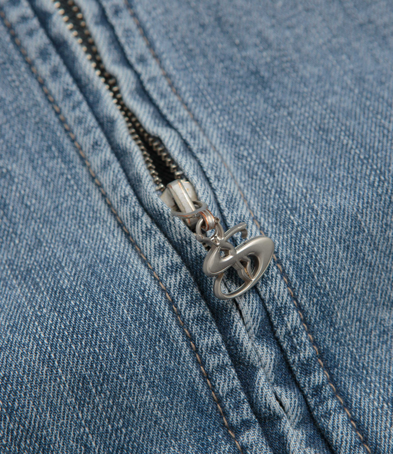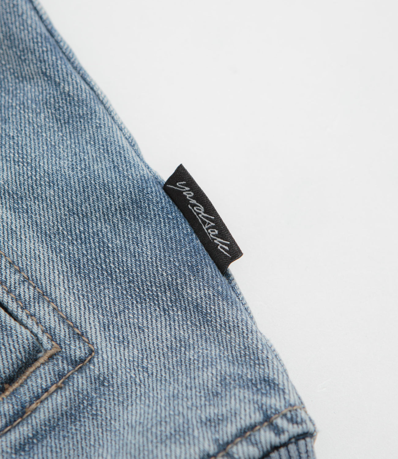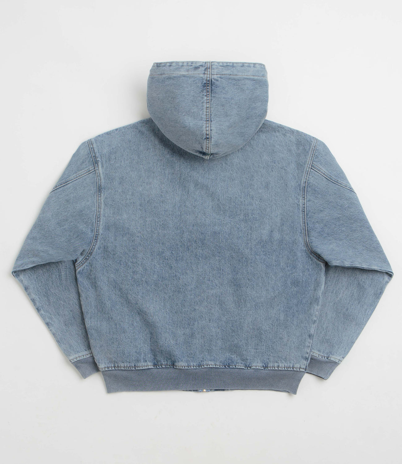Yardsale Denim Full Zip Hoodie in Blue. Detailed with faded patches, this regular fitting Yardsale hoodie is made from 100% cotton denim. Featuring an adjustable drawcord hood, a full length zipper fastening and a custom YS zip pull, this blue Yarsdale hoodie is finished with two front pockets, ribbed cuffs and a woven elastic hem.
