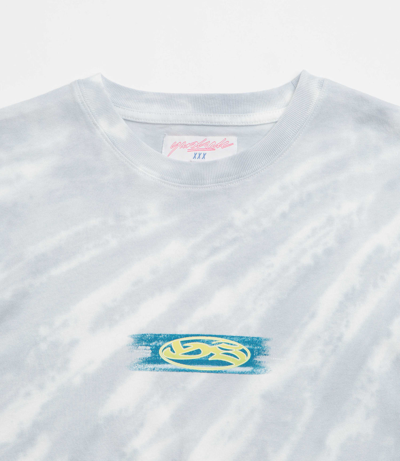Yardsale Lucid T-Shirt in Baby Blue. Regular fitting with a subtle tie-dye pattern, this Yardsale t-shirt is made from 100% cotton. Featuring a rib knit collar and a straight hem, this light blue Yardsale t-shirt is finished with a textured gel print logo.