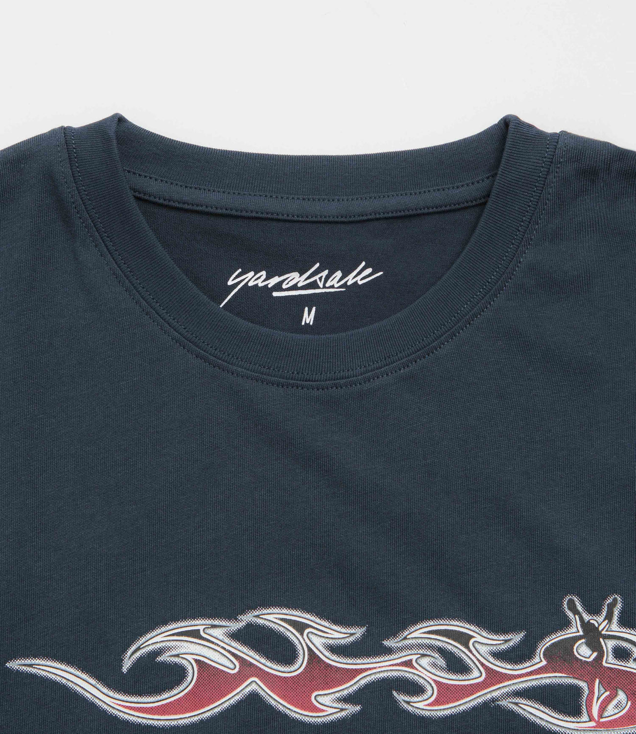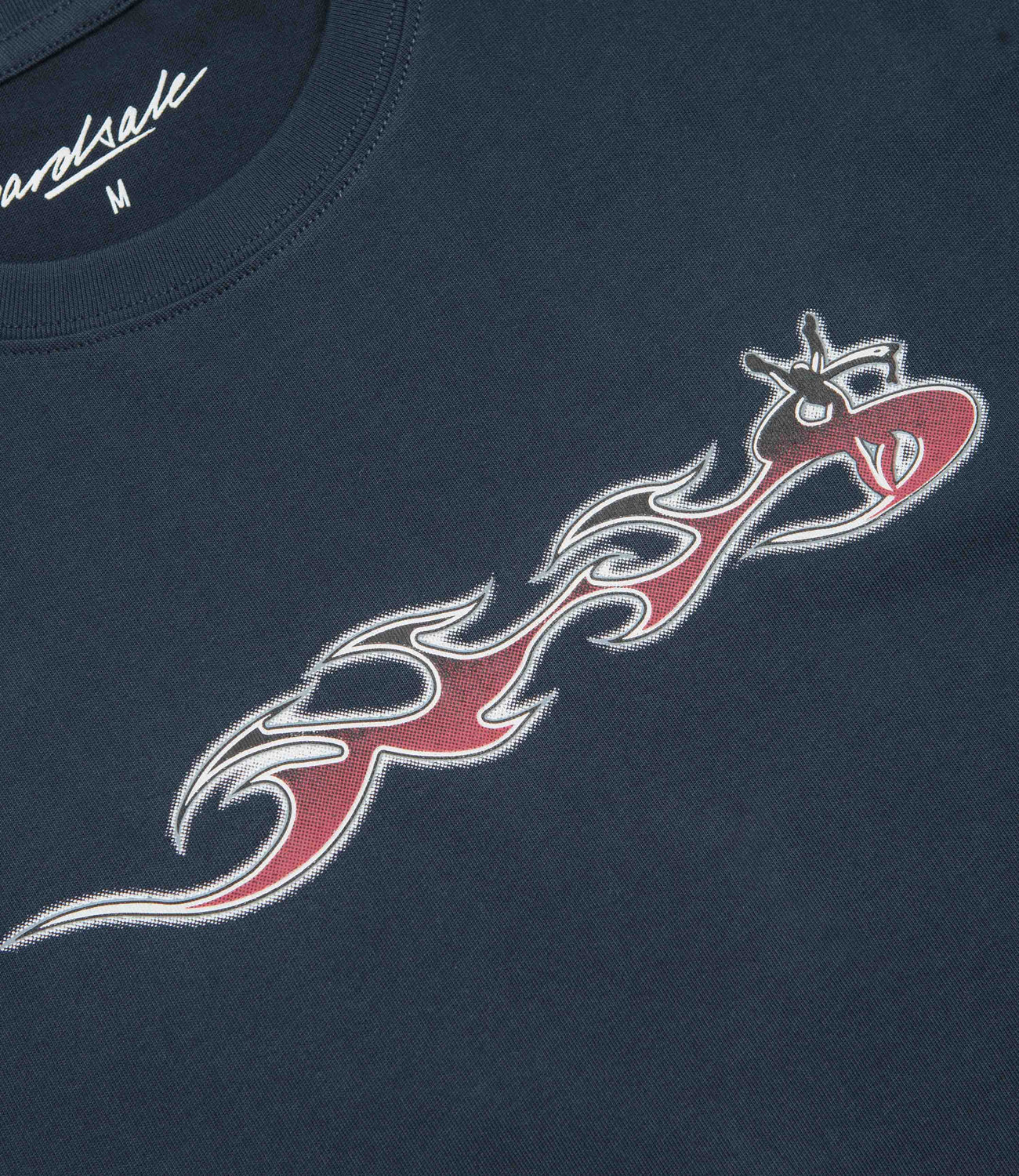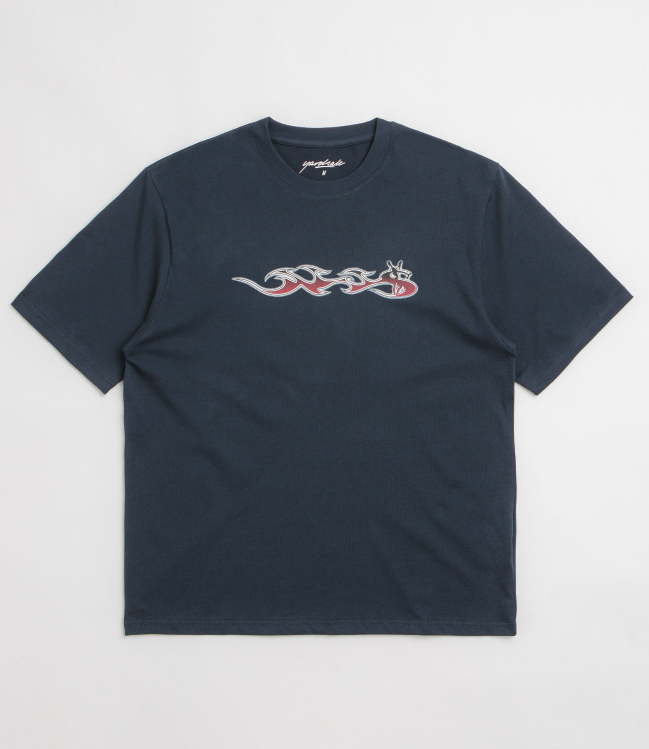 Yardsale Phantasy Flame T-Shirt in Navy. Made from 100% cotton, this block tone Yardsale t-shirt is designed with a classic crew collar and a straight hem. Finished in navy with a screen printed chest graphic.