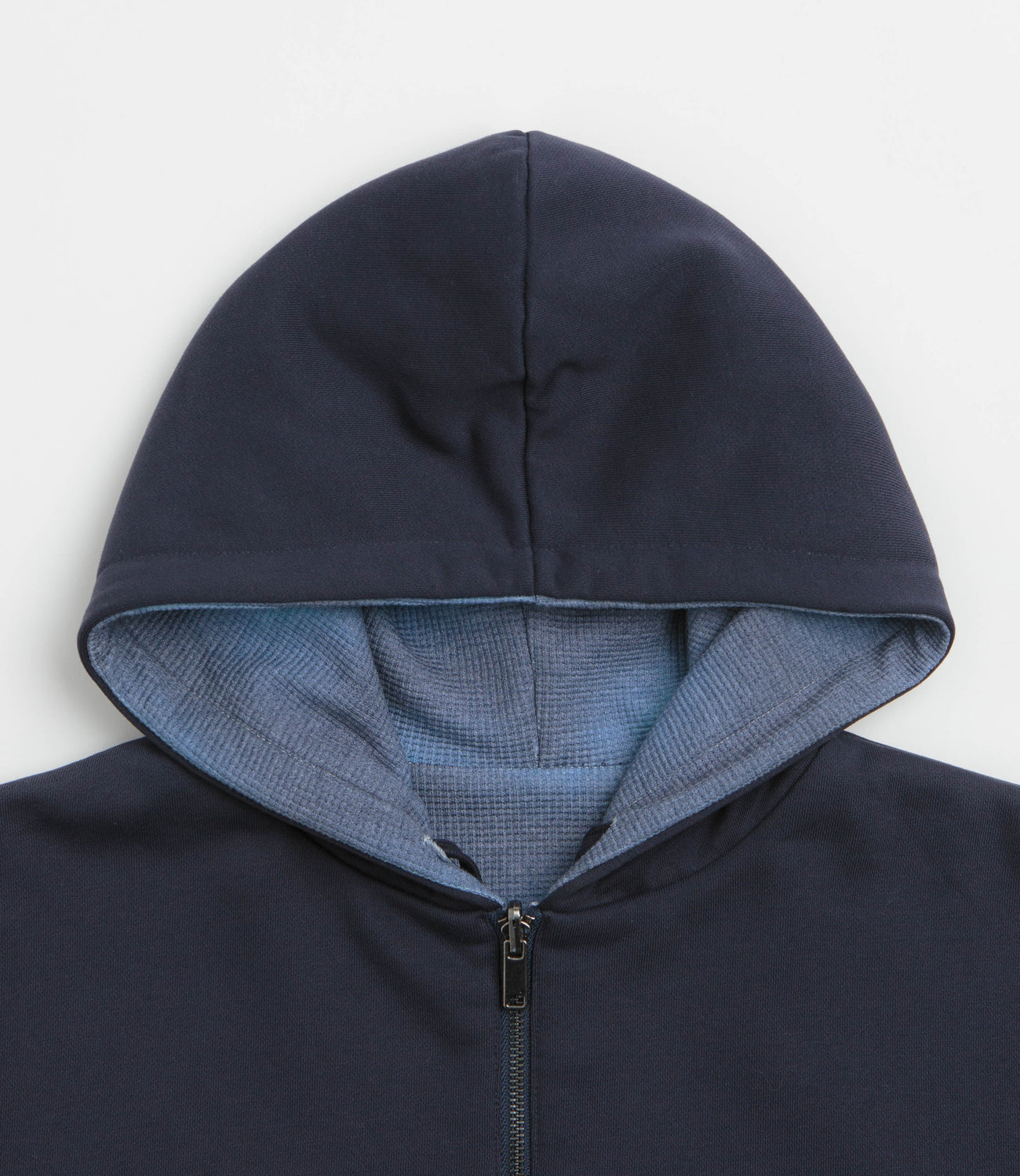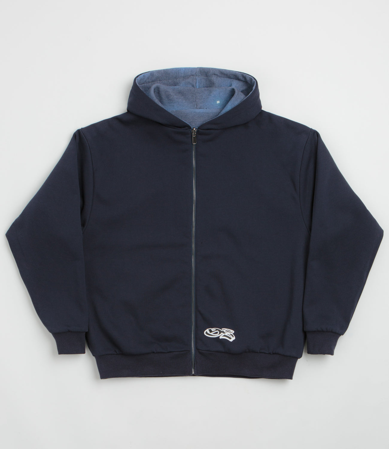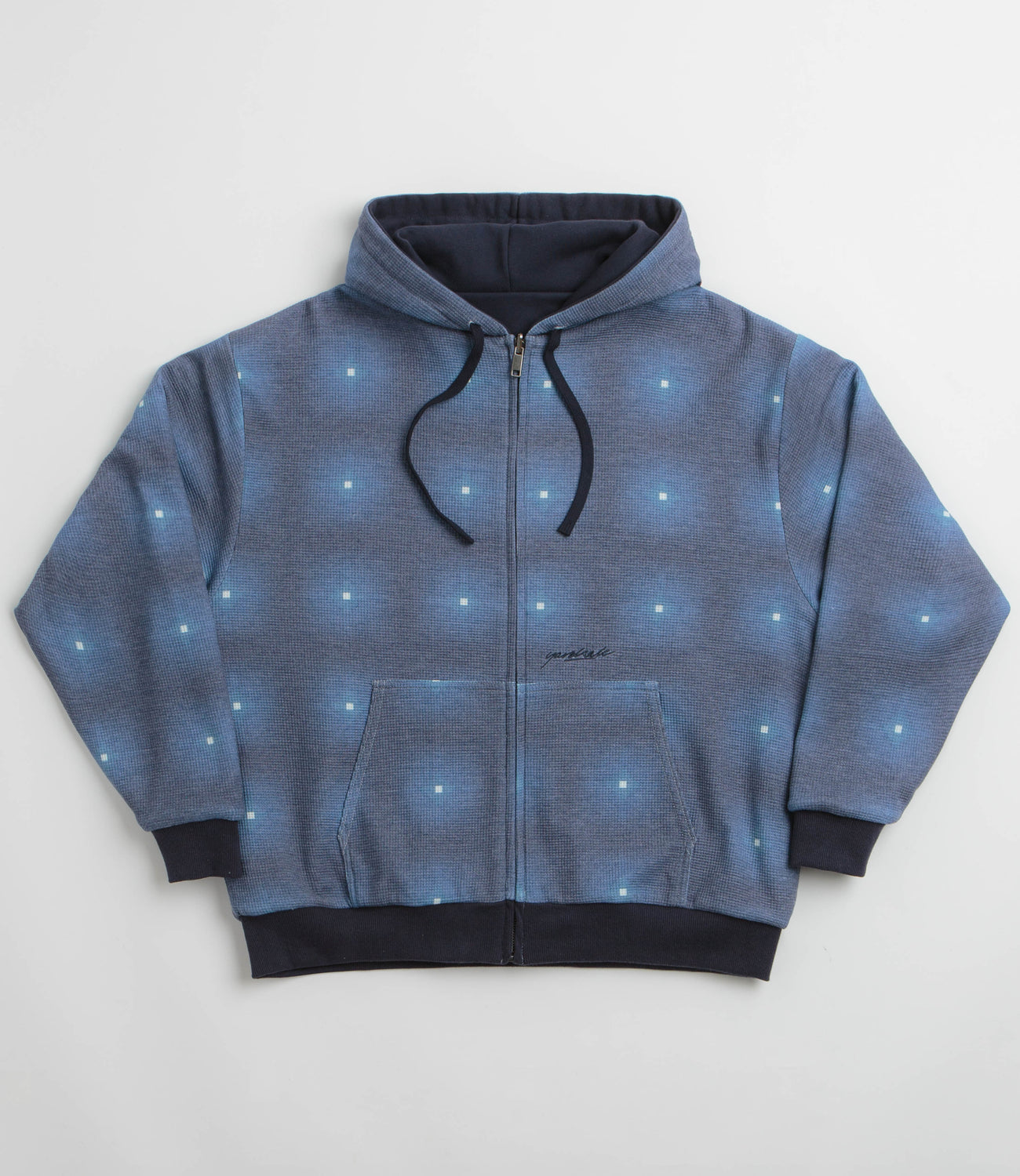 Yardsale Reversible Thermal Hoodie in Navy and Navy. Reversible and made from 100% cotton, this Yardsale hoodie is styled with an alternative thermal jersey side. Featuring an adjustable drawstring hood, a full length zipper fastening, ribbed cuffs and a woven elastic hem, this navy Yardsale hoodie is finished with two front pockets, a custom YS zip pull and embroidered branding.