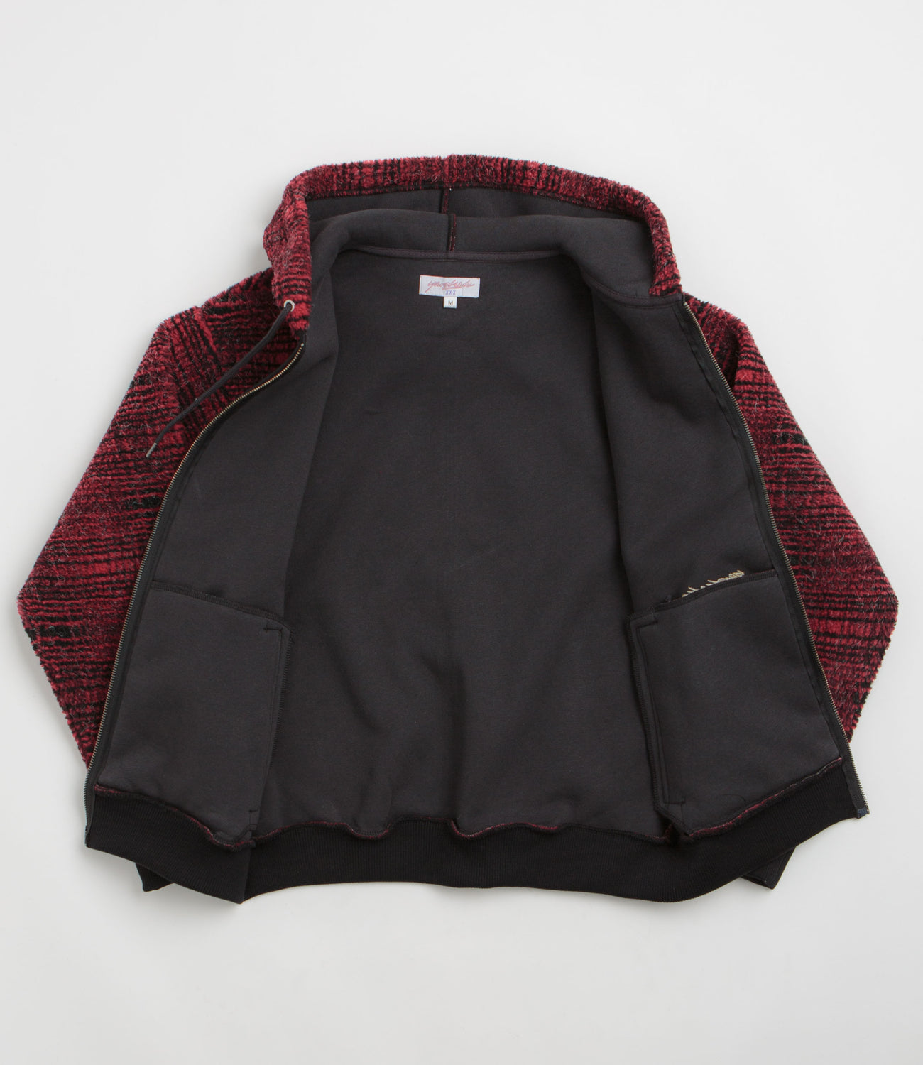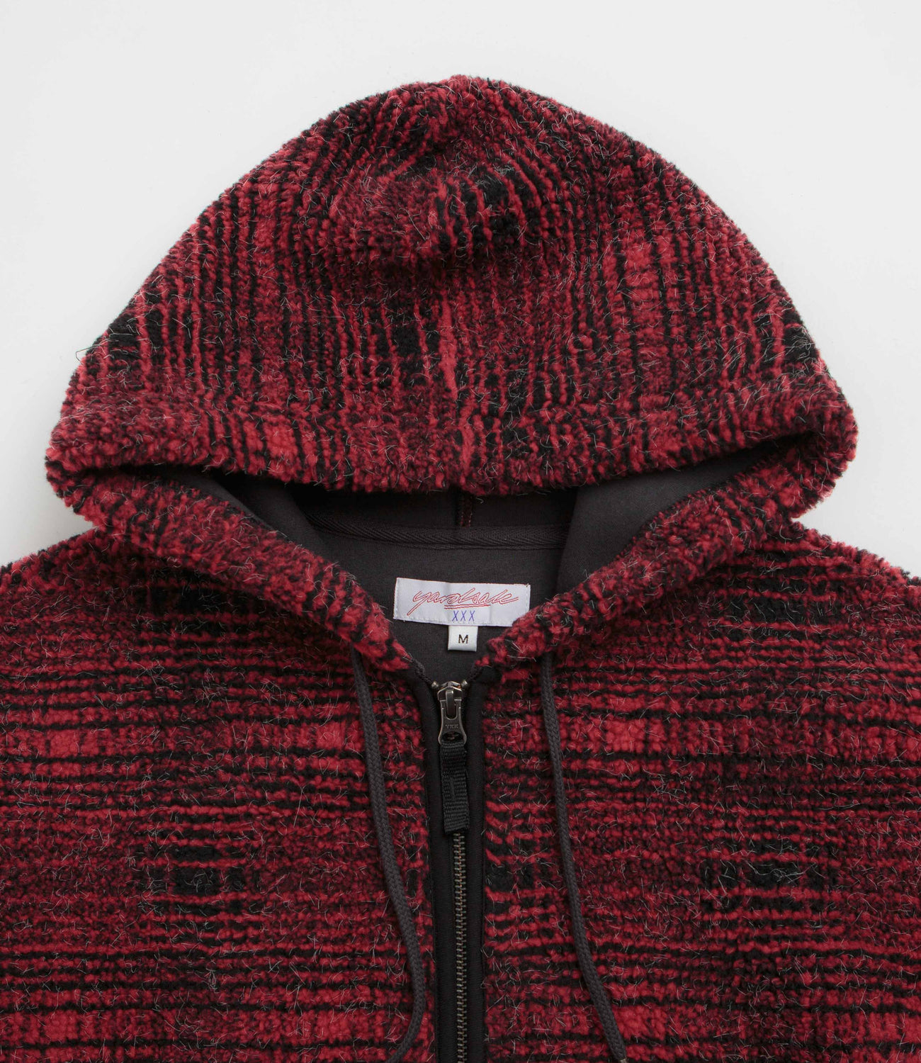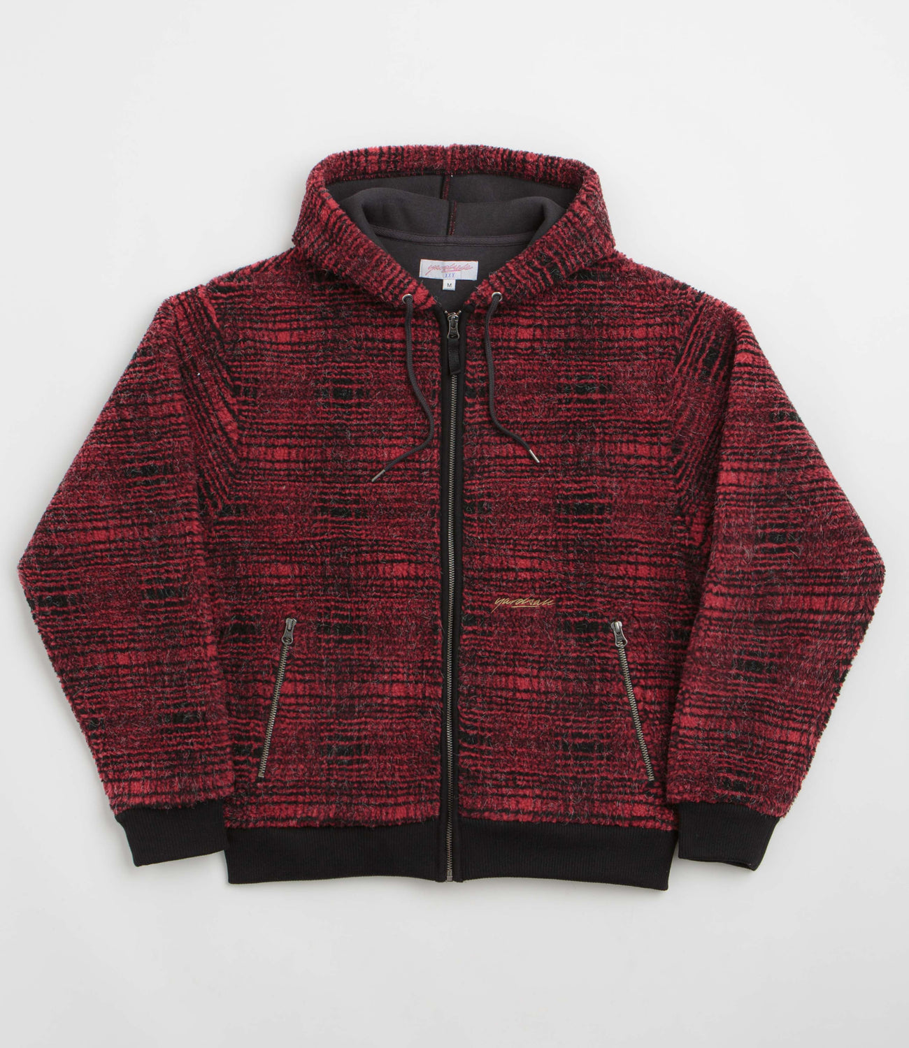 Yardsale Sherpa Fleece Hoodie in Red. Made from a cotton-polyester blend with a jacquard tartan pattern, this regular fitting Yardsale hoodie is designed with a drawstring adjustable hood. Featuring a full length zipper fastening, ribbed cuffs and two zippered front pockets, this red Yarsdale hoodie is finished with a woven elastic hem and with a custom YS zip pull.