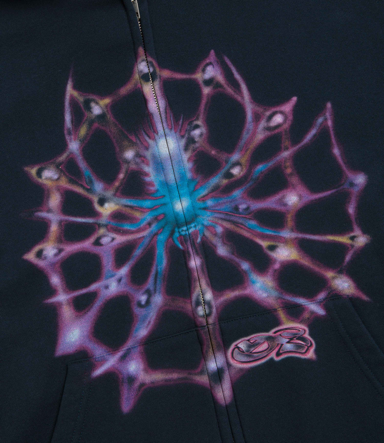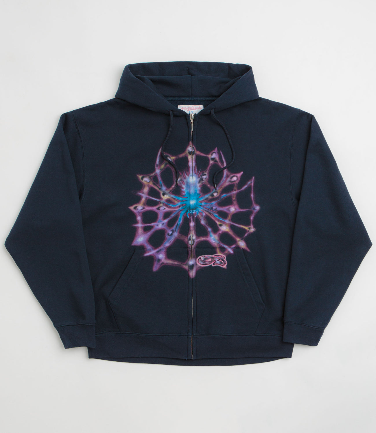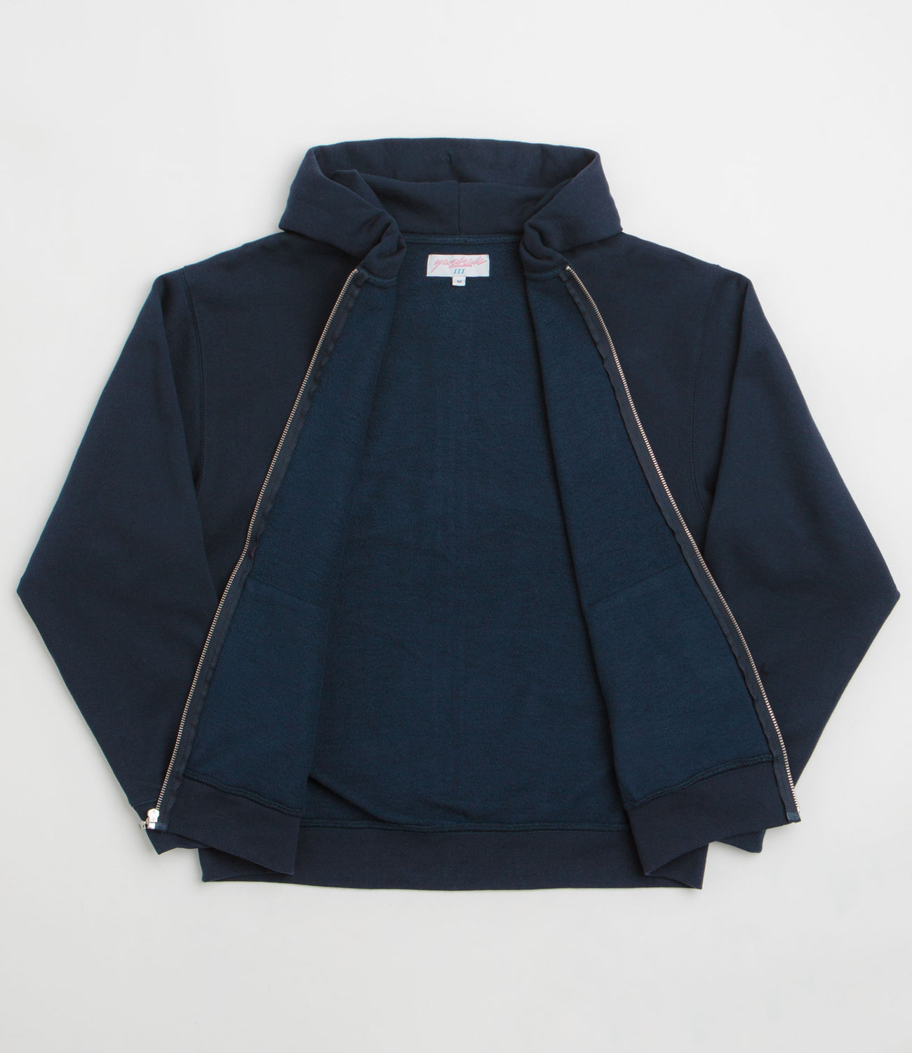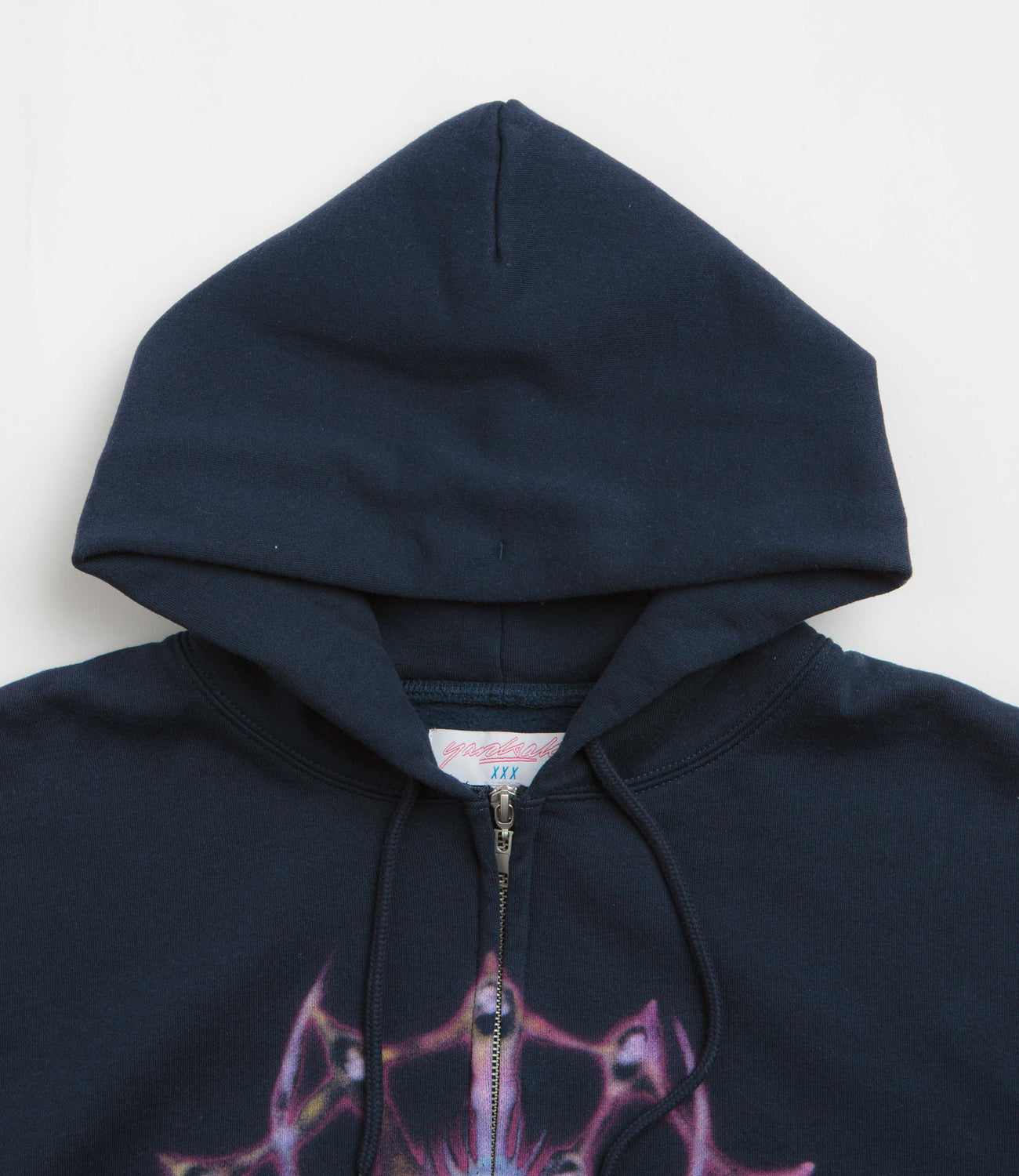Yardsale Webber Full Zip Hoodie in Navy. Regular fitting with an adjustable drawcord hood, this Yardsale hoodie is made from 100% cotton. Featuring a full length zipper fastening, two front pockets and ribbed cuffs, this grey Yardsale hoodie is finished with a screen printed chest graphic.
